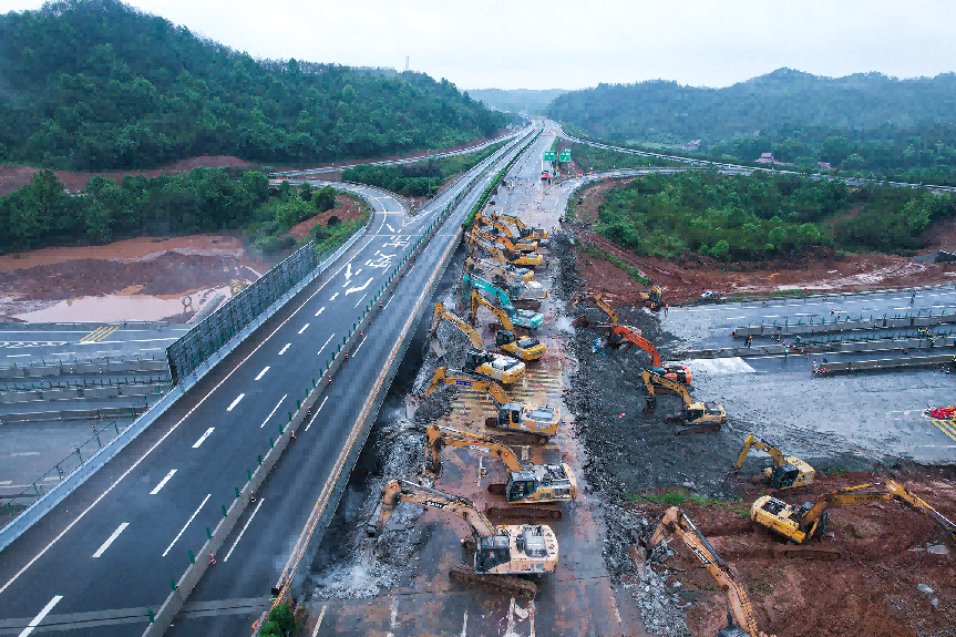 从13日7时,到5月14日凌晨2时,凿岩机、挖掘机、装载机轮番上阵,施工工人轮班作业,力图在规定时间内完成施工,恢复大广高速的交通。清晨5时,施工工人就到达了现场,现场负责人简单地集合队伍,强调施工要点后,就开始了施工前的准备工作。早上7时,施工路段正式封闭,工人们在桥底路面铺上土工布和沙子,以防止拆桥时将路面损坏。一切准备就绪后,随着现场施工指令下达,桥面上11台、桥下侧边7台凿岩机排列整齐,在预定位置开始破拆作业,现场技术人员通过对讲机指引着施工步骤,安全管理人员有序地维护着现场,雨水倾洒而下,将扬尘打湿在路面,但雨水丝毫没有影响工人们的干劲,哒哒的机器响声中,是进度条一直向前,现场的秩序井然。