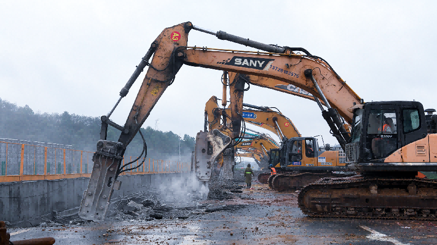 13日上午,天空飘着淅淅沥沥的小雨,泰和枢纽上,18台机器齐声轰鸣,凿岩机将桥面击穿,飞溅起混凝土碎块,液压钢筋剪断机将裸露的钢筋整理运走,挖掘机在一旁辅助,将散落的碴土整理堆放……这是吉康改扩建项目泰和枢纽互通泉南跨线桥右幅拆除现场,也是一个长达19个小时的施工接力赛场。