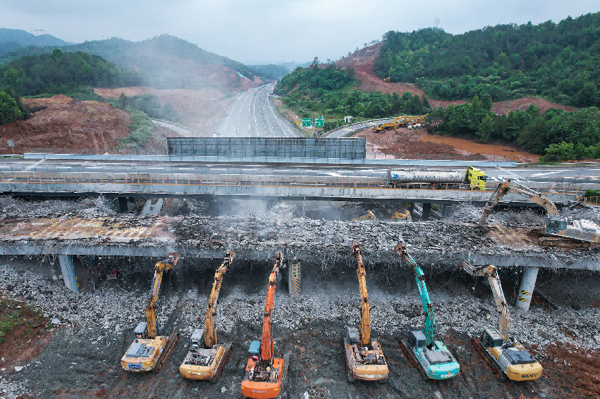 2022年5月13日7时至14日凌晨1时40分左右,在吉康改扩建项目办主要领导的现场督导下,A2标44名机械操作手和34套大型破拆机械设备历经19小时连续奋战,项目首座跨线桥—大广高速(G45)泰和枢纽互通泉南高速(G72)右幅跨线桥顺利拆除,现场恢复正常交通。
