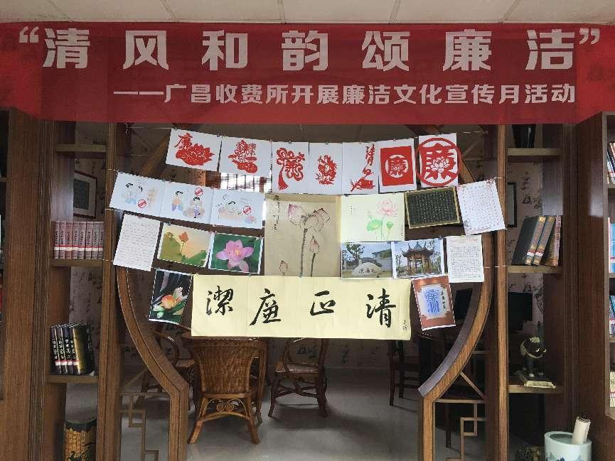 为深入开展廉洁文化活动,抚州管理中心广昌收费所紧扣“清风和韵颂廉洁”活动主题,以廉洁文化宣传月为契机,开展一系列有特色、多形式的勤廉教育活动,将廉洁的观念渗透到全所每一位干部职工的心中,让宣教月各项活动接地气、扬正气、聚人气。