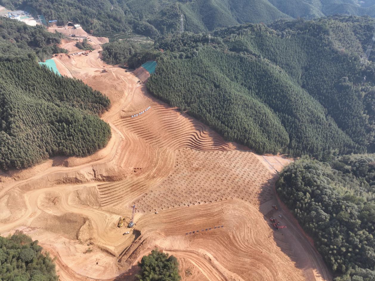 遂大高速K299+444-K299+843段路基位于崇义县铅厂镇境内,最高填方位于桩号K299+605,填筑高度为72.3米。如果拿现行标准楼房层高相比,则可达24层楼的高度,能够俯瞰某座县城。据项目技术人员介绍,该路基填方是江西省高速公路建设史上最高的路基填方,路基填方总数量约100万方,填土主要利用本标合格土方及西峰隧道洞渣。桩号路段周边及红线内环境复杂,路线横跨山间狭长冲沟,其间发育有一条小溪,横向地形微起伏,地表被改造成脐橙种植地,地下水埋深0.8米左右。