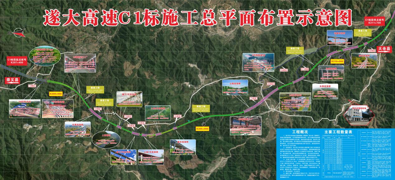 由中建三局承建的遂川至大余高速公路新建工程C1标段起点K297+400,沿崇义县铅厂镇,途经西峰村蕉坑并出崇义县,进入大余县浮江乡坑尾,经下南村,终点桩号K311+700,线路全长14.3公里,线路总体呈北至南走向。项目设计主线高架桥双向四车道,设计速度100公里/小时。