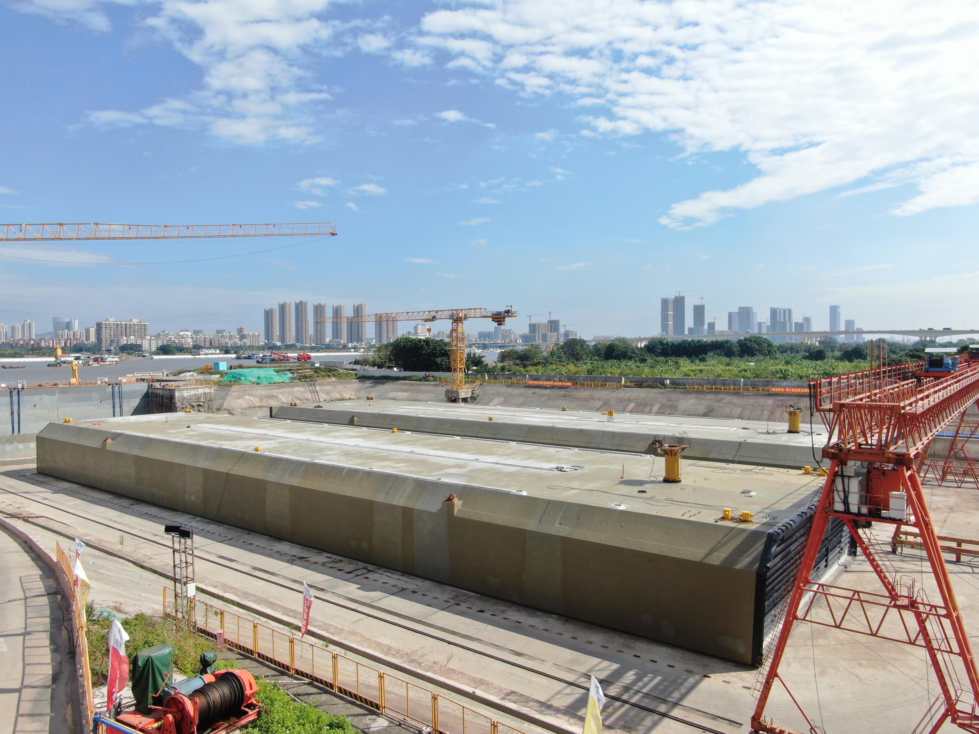 中交四航局项目负责人黄文慧介绍:“广州车陂南沉管隧道是广州市首个PPP市政项目,是连接广州国际金融城与琶洲大湾区琶洲数字经济创新试验区的战略发展通道。车陂南隧道南起海珠区新港东路北侧,与阅江路相交,下穿珠江,向北与天河区在建的临江大道、花城大道相交,终点至现状黄埔大道交叉口。道路等级为城市主干道,道路规划宽度60米,过江隧道段双向6车道,设计车速为60公里/小时。车陂南沉管隧道是目前国内在建单管节最长的隧道,隧道全长约2.07公里,其中沉管段全长492米。车陂南沉管隧道,于2017年12月开工建设,其中下穿珠江沉管段共计4个管节,每个管节又分7个单节管节,单节管节长123米,每个沉管管节高8.7米,重约3万吨,相当于近16个标准泳池的水量总和。”