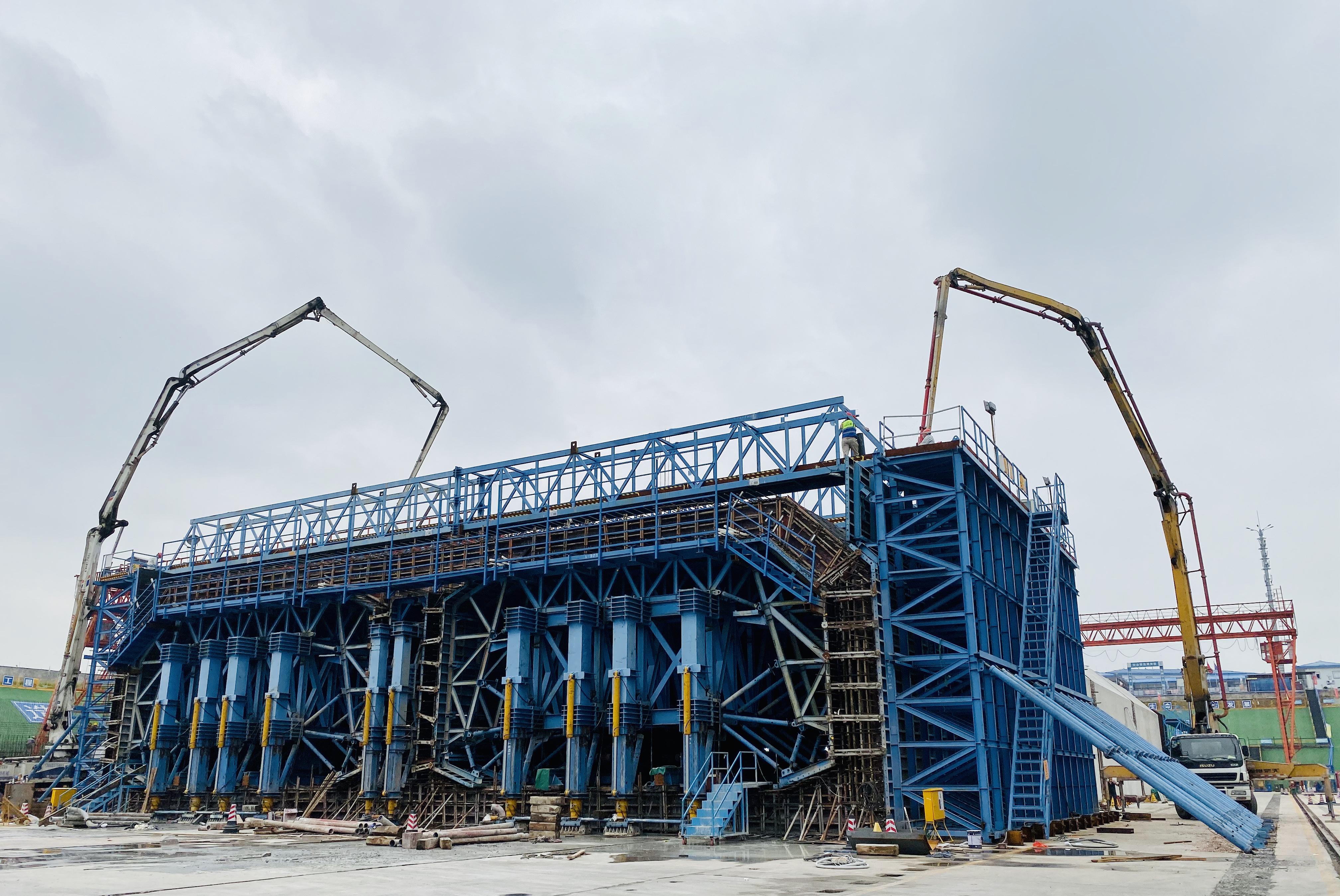 步履式模板主要应用于路桥、隧道等施工领域到,应用在沉管预制领域在国内还没有相关案列和经验可供参考,项目团队只能摸着石头过河。朱成带领技术团队积极开展技术攻关,勇闯沉管预制领域技术无人区,同模板厂家开展了为其三个月的试验论证,光是设计图纸便堆积了半米高。“由于想法太过超前,起初厂家难以理解,我们只能通过一次次的建模、绘图同厂家展现我们设计诉求。”回想起研发新式模板的场景,朱成记忆犹新。