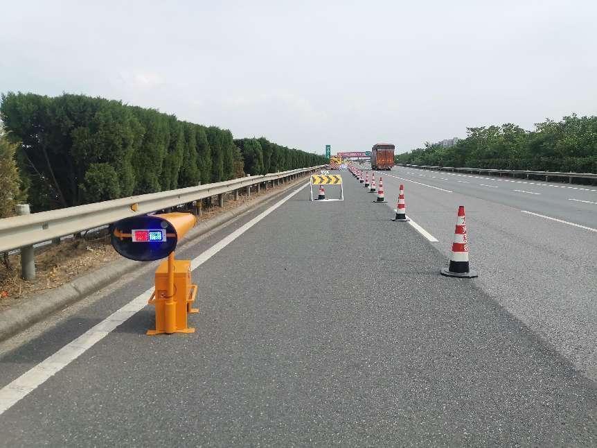 在温沙大修养护工程现场,声光一体降车速、高速施工防撞车、智能机器人、智能安全帽、智能手环、智能路警协调、江西第一台智能安全锥收放机等设备和措施一应俱全。为了解决传统声光警报器续航时间和声音传输距离短、耗电快、播放声音小、元件易损坏等弊端,该项目专门创新设计了一款名为“赣东一号”的电压逆变强磁喇叭,该款喇叭采用大功率发声单元和定向高功音芯并使用了船舶扬声器振腔式加长加厚型共振传音筒,通过独特的声学技术和算法,使声源沿着指定的路径传送声音,形成指向性声源,可实现声波的定向传播。此外,该喇叭还采用了动力电池,大电流耐力久,无须外接电源,可通过换电或串联实现超长续航适合各种工况和长时间工作的养护施工环境,相比高速养护施工传统警报器的续能时间增加了5倍,传输距离增加了3倍。