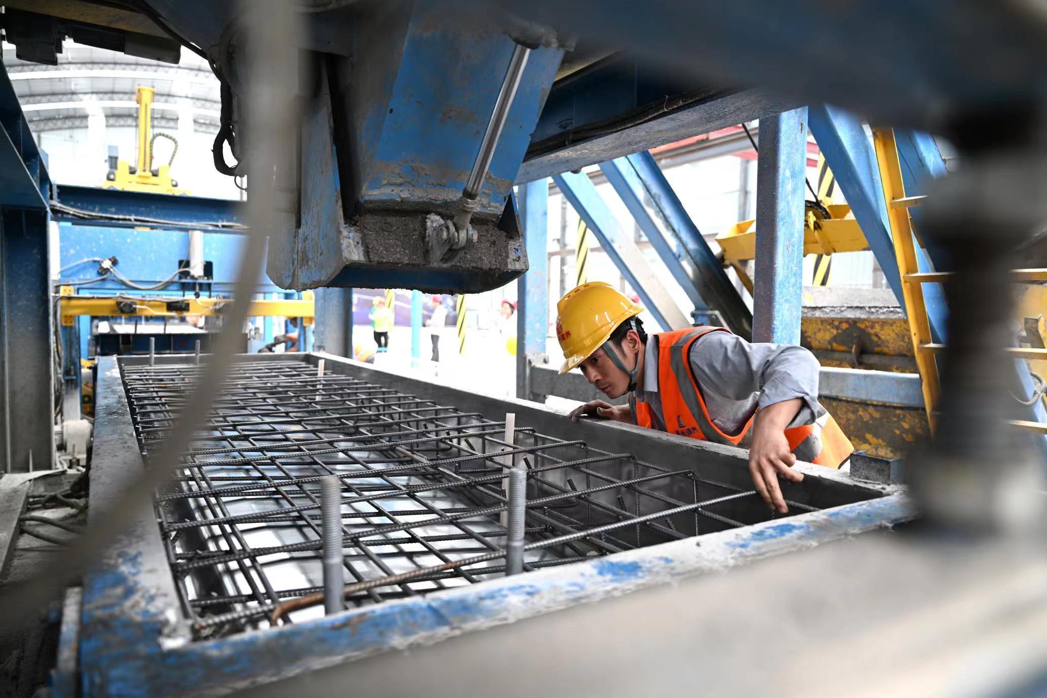 目前已建成投产的预制厂占地面积约3000平方米,整个厂区由智慧生产线、钢筋加工区、智能化控制室及室外成品存放区组成。智慧生产线为全省首次引进,包含全自动布料系统、收面抹光系统、RGV入窑及出窑摆渡运输系统、蒸汽养护窑、全自动拆钢模系统、真空取成品吊装系统、钢模自清洁及喷涂脱模剂系统组成。