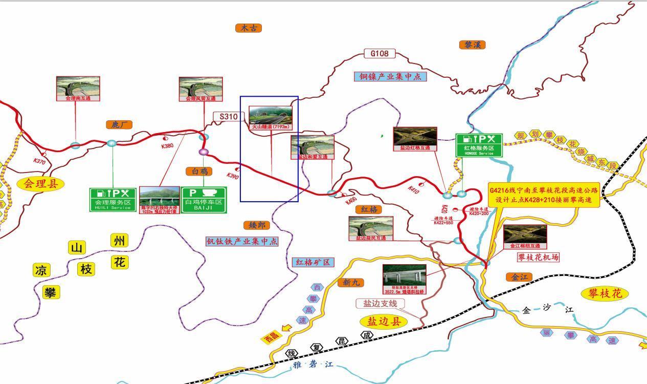 宜攀高速宁攀段起于凉山州宁南县城南,经宁南县、会东县、会理县、盐边县,止于攀枝花市仁和区。项目全长166.167公里,同步建设盐边等11条连接线,共计44.473公里。主线采用双向四车道高速公路技术标准,设计时速80公里/小时,全线桥隧比69%(其中隧道占比39%),主线设置12处互通式立交,概算总投资297.62亿元。截至目前,宁攀段已建成通车会东北至小黑箐、盐边和爱互通至金江枢纽互通共计87公里。