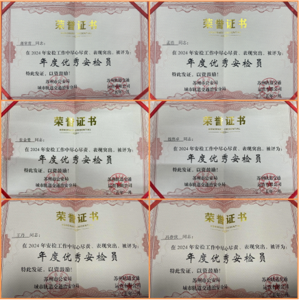除了团体奖项,个人荣誉方面,江苏营财安保股份有限公司同样成绩斐然。1号线的蒋常青、孟浩,2号线的佐金曼、钱伟卓,以及6号线的王丹、冯春侠,这6名安检员凭借过硬的专业技能、高度的责任心和始终如一的优质服务,从众多安检人员中脱颖而出,荣获“优秀安检员”称号。他们在日常工作中,始终保持高度警惕,不放过任何一个安全隐患;面对乘客,始终耐心细致,用微笑和专业服务赢得了乘客的理解与尊重 。他们不仅是各自线路上的安全守护者,更是苏州轨道交通安检队伍的杰出代表。