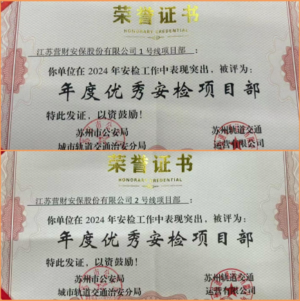 在此次表彰活动中,江苏营财安保股份有限公司旗下的 1号线和2号线项目部脱颖而出,荣获 “年度优秀安检项目部” 称号。这一荣誉的背后,是无数个日夜的坚守与付出,是全体项目成员团结协作、共同努力的结果。这不仅是对两个项目部工作的高度认可,更是对营财股份在苏州轨道交通安检领域所做出的卓越贡献的充分肯定。这一成绩的取得,无疑为公司树立了良好的品牌形象。