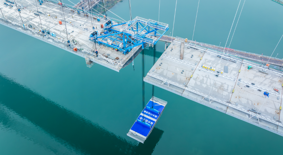 藤州浔江大桥是世界首座独塔空间缆斜拉-悬索协作体系桥梁,全长1604米,主跨采用2×638米全漂浮体系钢箱梁,主塔为“三角塔”造型,塔高238米,是广西最高桥塔。大桥巧妙结合了斜拉桥和悬索桥体系的优点,在桥塔近端采用斜拉体系,远端采用悬索体系,中间设置80米的交叉区以实现双体系的过渡。独特的桥型结构,使得桥面被划分为塔区、斜拉区、交叉区、吊索区、无索区和合龙段六个段落。钢箱梁吊装过程中,浮吊起吊安装方案、吊架提升方案、桥面吊机同步吊装方案等轮番上阵,一举解决了钢箱梁吊装的系列难题。