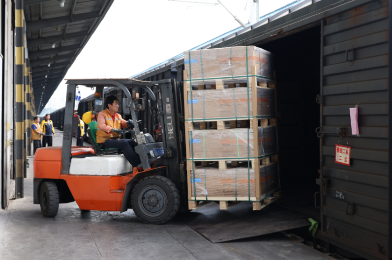 10月23日下午,位于昆明市王家营火车站的14道货场内一派繁忙景象,装卸人员把包装好的光伏组件、瓷砖、饮料、大米等货物依次装入棚车,当晚,这些货物“搭乘”昆明至临沧整车混装白货班列,于次日到达577公里外的临沧站。