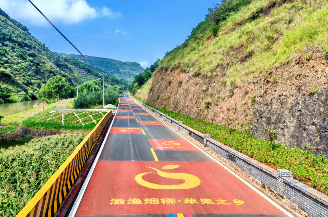 沈家沟景观点依河而建,3000平方米区域采用立体绿化,本地杜鹃、麦冬点缀,“前花后树、上乔中灌下草”,陶瓷颗粒彩色路面勾勒苹果图案,将公路打造成流动的昭通文化展示窗口;大关县境内的“山水大关、筇竹之乡”节点,毗邻靖安竹笋加工厂,拓宽路面与绿美景观结合,彰显“筇竹之乡”特色,赋能“山水大关”形象。