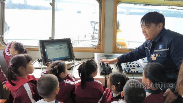“这艘大船为什么能稳稳地‘坐’在江中?”面对孩子们的提问,航道人员用“江上驿站”作喻,将趸船的功能娓娓道来,讲解生动而有趣。在航标工作船的驾驶室,孩子们簇拥在船长身边,好奇地观察着各式精密仪器。船长耐心讲解航行知识,将“航标如何指引方向”“如何安全避让”等专业内容,化作孩子们能理解的语言,在他们心中播下了一颗探索黄金水道的种子。