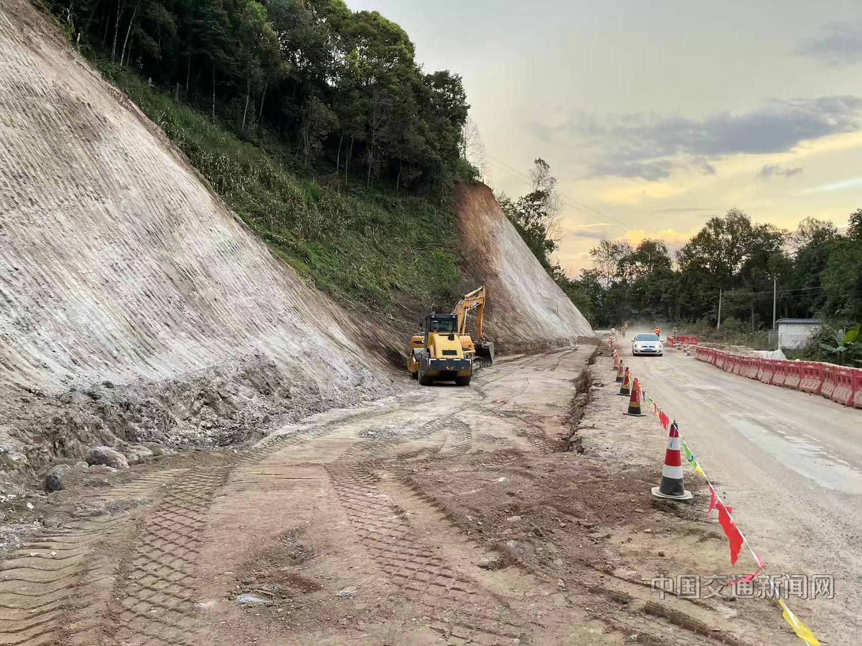 在抢险现场,机械轰鸣与抢险人员的忙碌身影交织成民生守护图景。经过一个多月的连续抢修,110米长、7米宽的临时便道在公路右侧快速形成,满足车辆双向交替通行需求;105米直径30厘米排水钢管铺设于原排水沟,大幅提升排水能力,从源头规避渗水对便道基础的侵蚀;630立方米挖方清障、2200立方米风化料填筑压实,层层筑牢便道承载力,为通行安全加码。抢险过程中,团队同步实施边坡临时防护,实现施工与通行安全双向保障。
