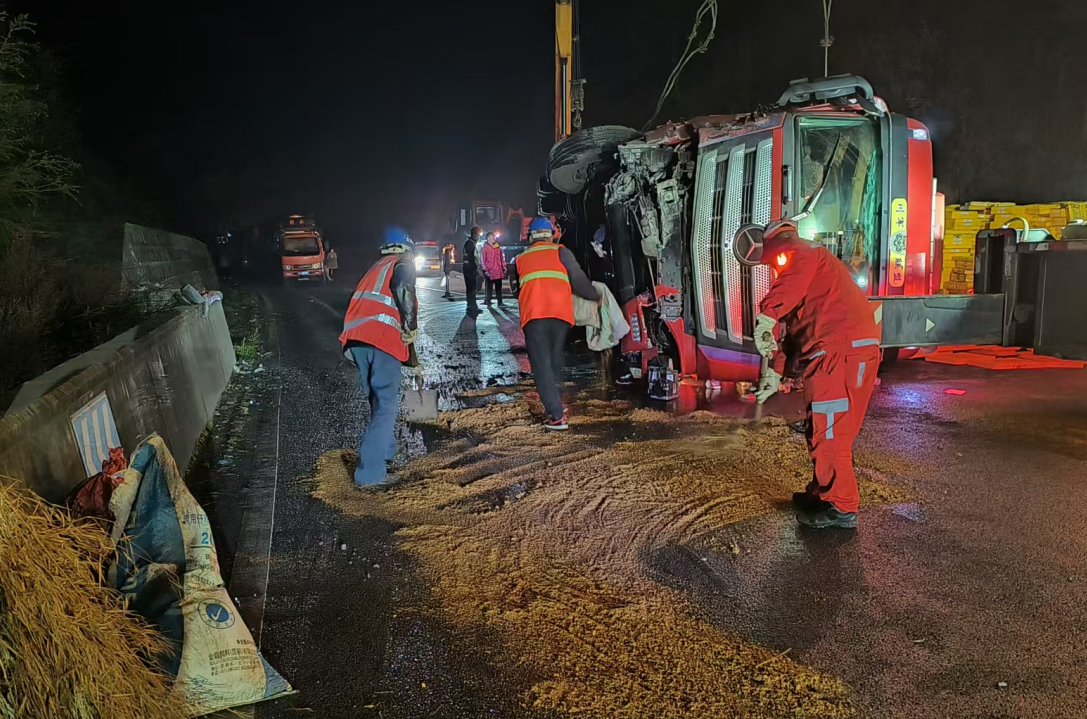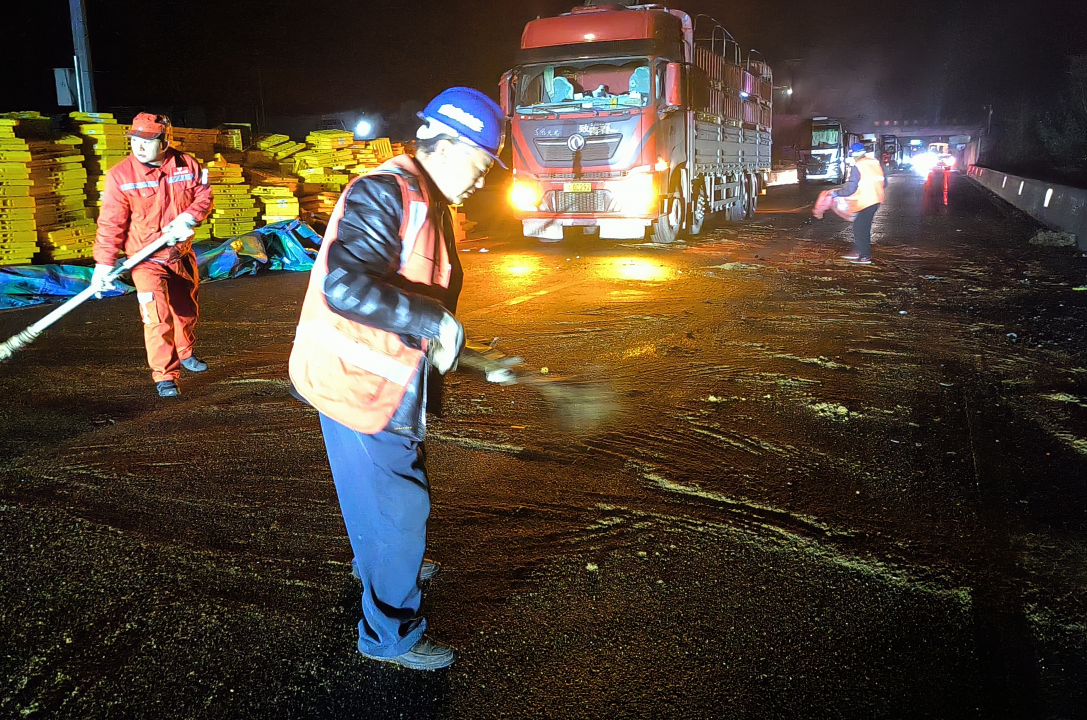11月19日23时46分,夜色正浓,G213策磨线会泽段K3128+300路段突发紧急情况,一辆大货车行驶中不慎侧翻,车上货物散落路面,油箱破损,燃油泄漏,污染面积达150平方米。泄漏的柴油在夜间低温环境下极易结冰打滑,不仅造成道路双向交通中断,更给过往车辆和行人带来极大安全隐患,也对周边道路环境构成威胁。
