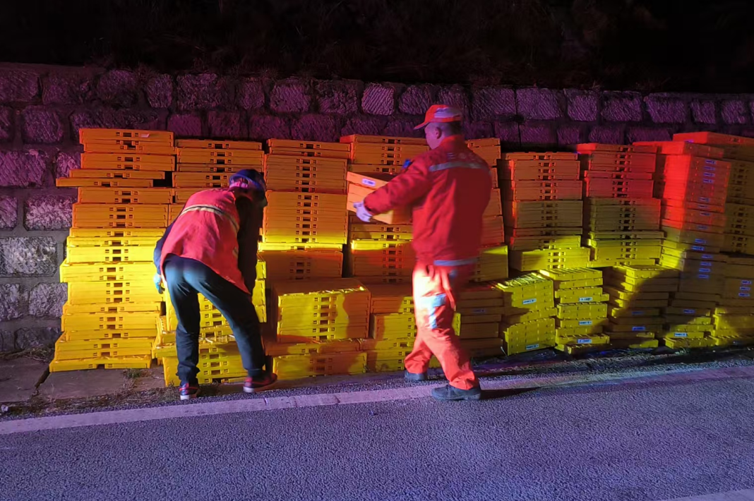 事故现场,气温已接近零度,寒风吹得人瑟瑟发抖。到达现场后,抢险队伍和交警一道拉起安全警戒带,在事故路段前后合理布设警示灯、反光锥等安全标志,并安排专人配合引导过往车辆有序绕行,坚决防范二次事故发生。有的队员徒手捡拾清理散落货物,哪怕手指冻得僵硬,仍有条不紊地将货物归拢堆放;有的先均匀撒布木屑吸附路面浮油,快速阻断油污扩散并增强路面摩擦力,最后启动滑移扫地机,对清理后的路面进行全方位清扫,确保路面无油污残留、无杂物堆积。社会救援人员操作清障车吊臂精准作业,小心翼翼固定侧翻货车车身,调整角度后稳步将车辆拖离事故核心区域,为路面清理创造安全条件。夜色中,交警的荧光绿、抢险人员的反光背心在车灯映照下格外醒目,他们弯腰作业、俯身清理的身影与呼出的白气交织,构成寒夜中最动人的抢险图景。