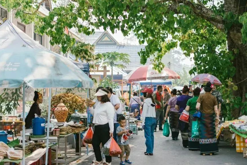 “老庚见老庚,快乐一整天!”“老庚”在傣语里意为“年龄相仿的朋友”。每到大赶摆时,中老两国的“老庚”一大早就来到曼烈村民小组摆摊。烤鸡、烤鱼、老挝冰咖啡、手工香皂、竹编等东南亚商品应有尽有。舂鸡脚、臭米线、酸鱼酸肉等让人目不暇接,充满了浓郁的人间烟火气。