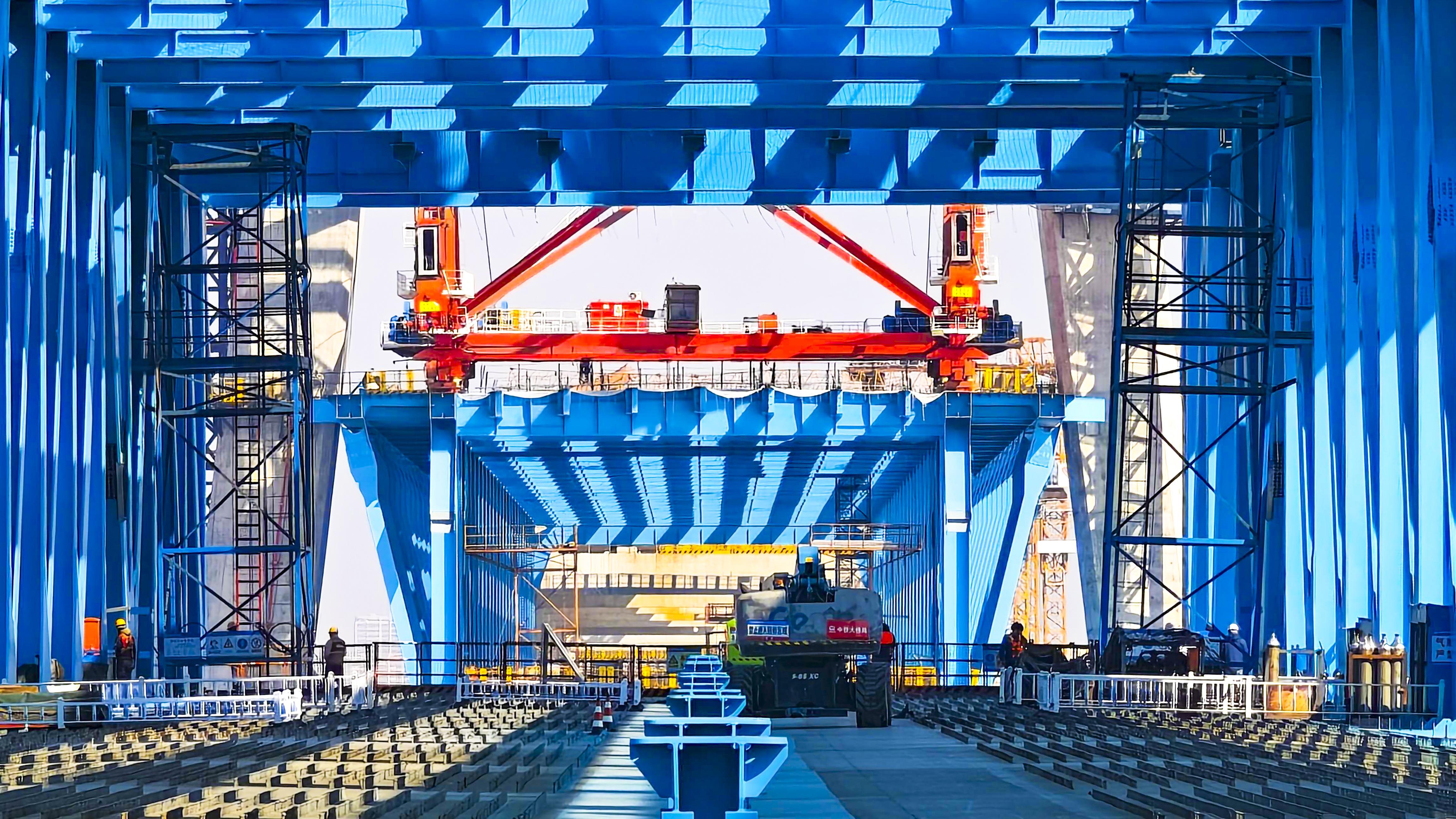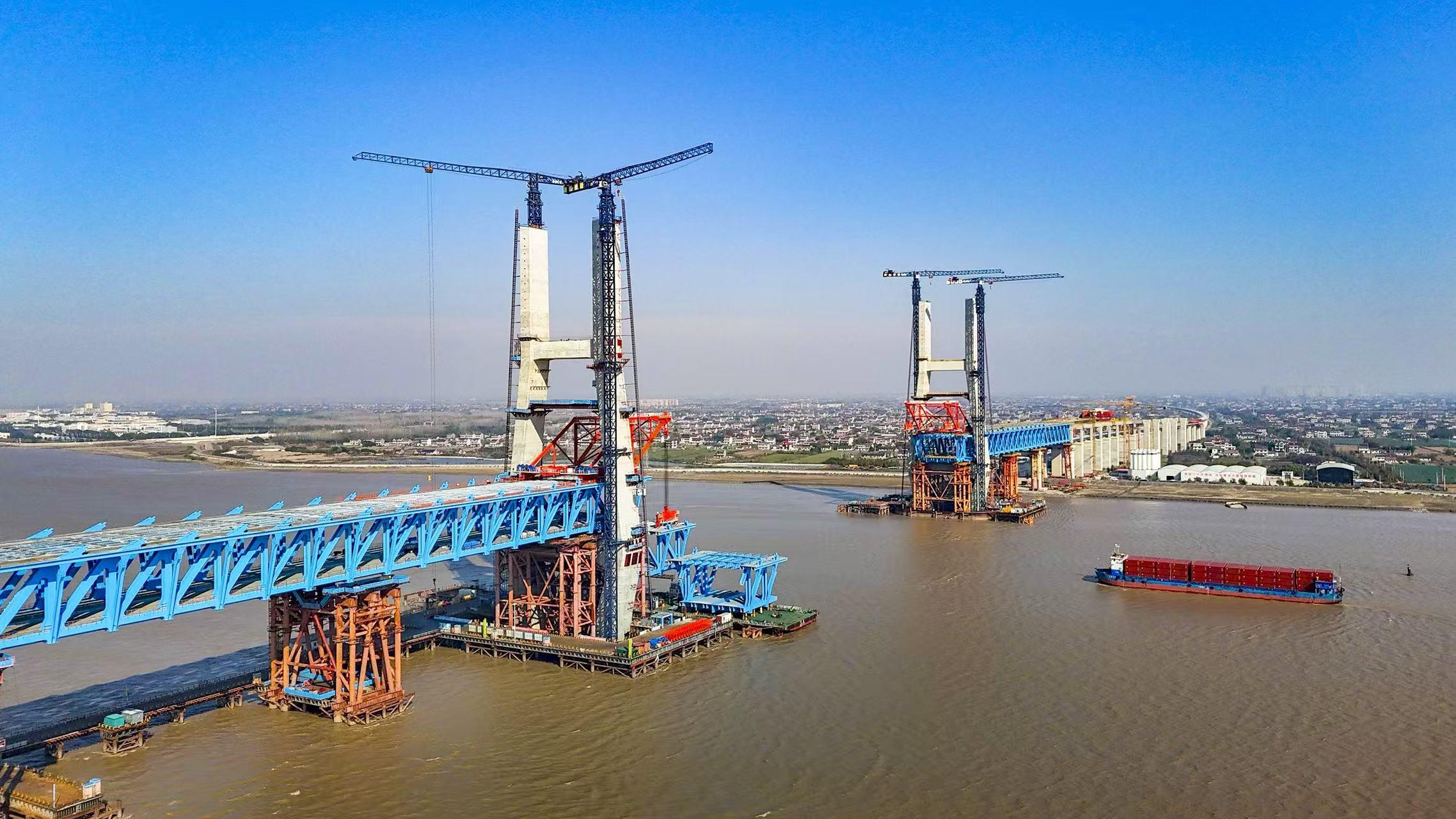 现场技术负责人江湧介绍,随着南北边跨钢梁相继吊装就位和顶推施工完成,崇启公铁长江大桥将开始边跨钢梁落梁、支座安装和体系转换,进行边跨桥面板、中跨钢梁和斜拉索等安装。