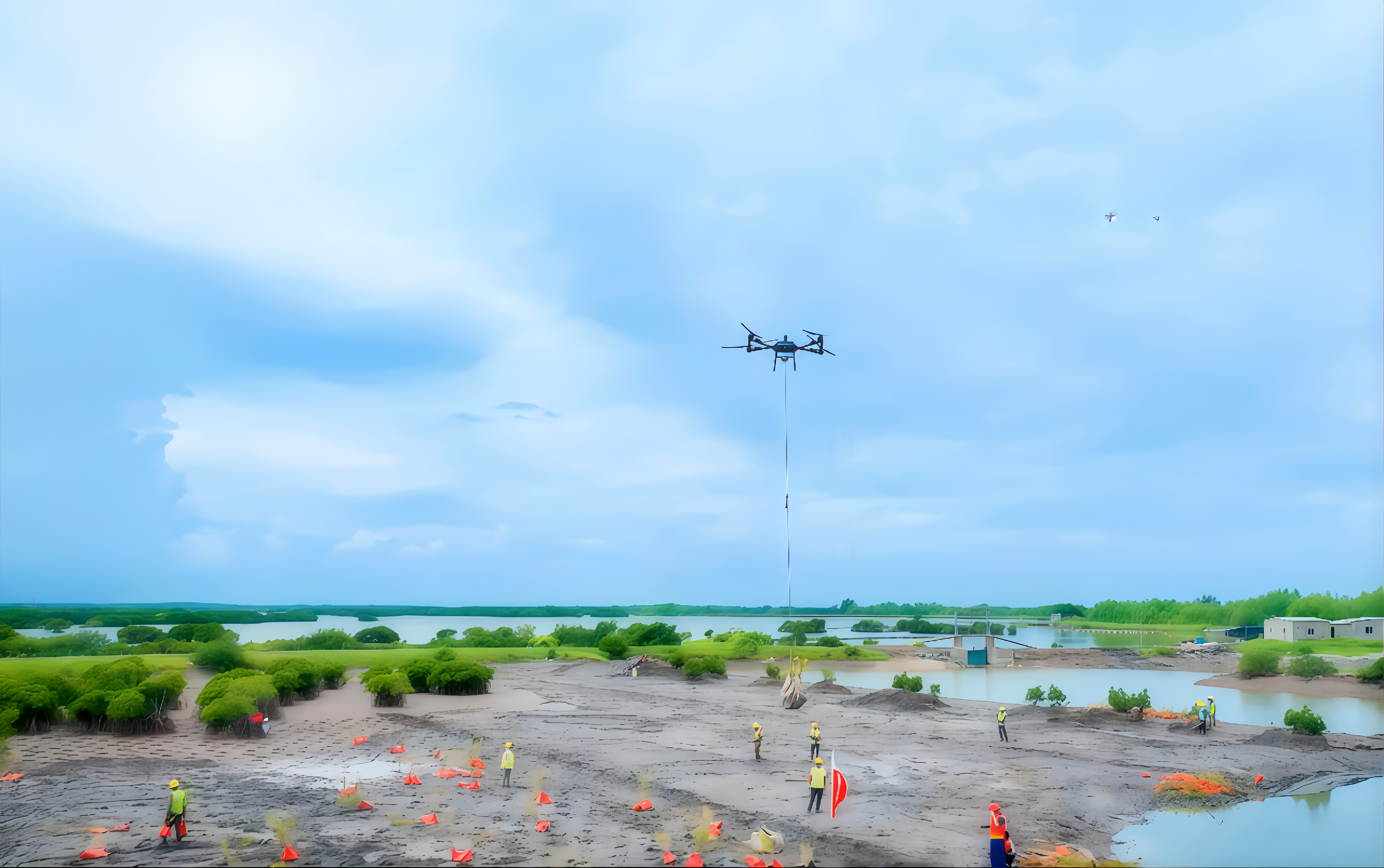 此外,在项目546公顷的广阔修复区域中,由于远岸区域难以涉足,传统人工作业效率堪忧。项目团队创新采用无人机投苗模式,精准投放甄选后的白骨壤、红海榄、桐花树等本地树苗,高效打通滩涂投苗的“最后一公里”,破解了远岸作业的核心难题。