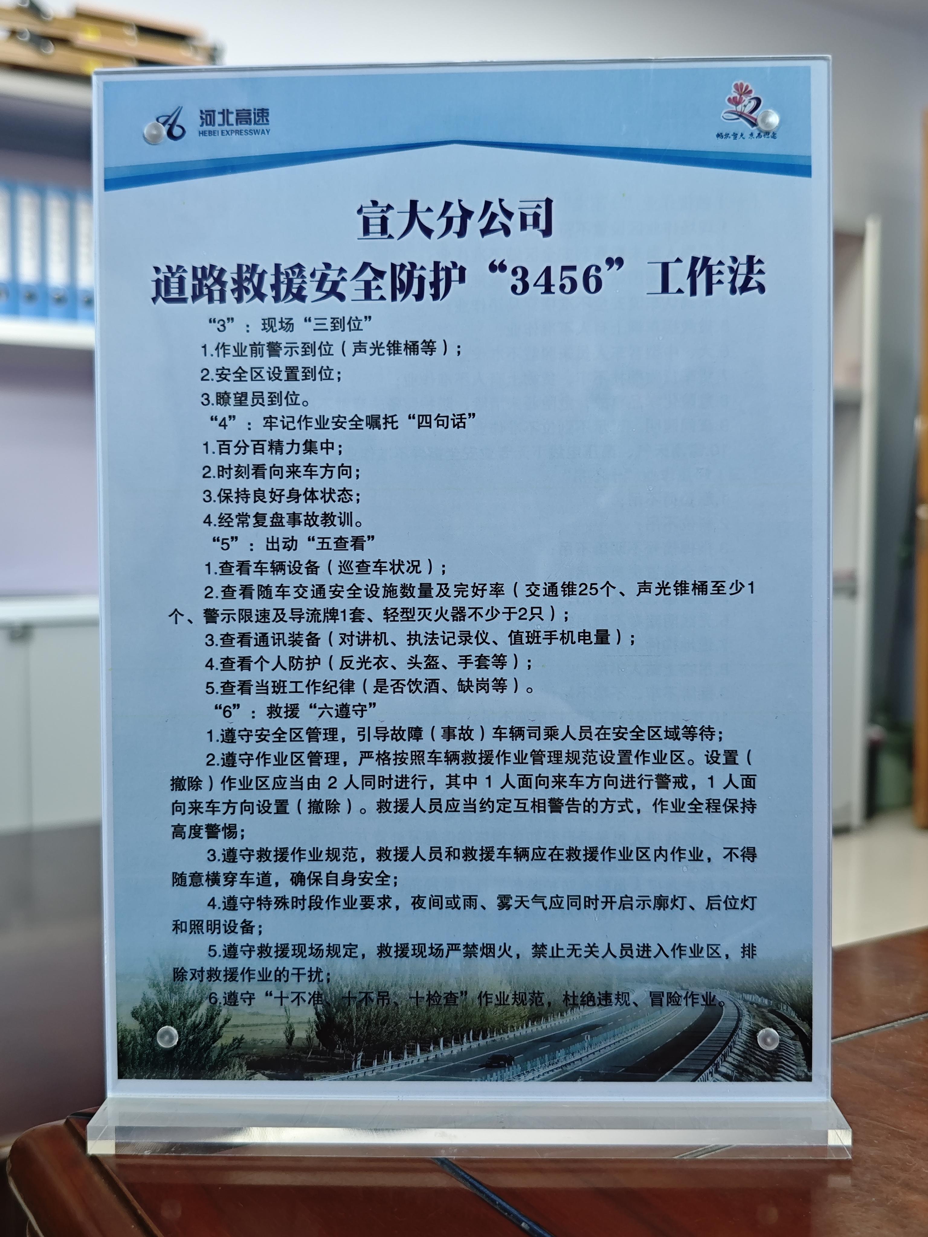 此次推广活动,宣大分公司将核心内容设计制作成便携桌牌,发放给应急救援一线人员并开展现场讲解,进一步推动该工作法深入人心。公路救援“3456”工作法凝聚了宣大分公司在公路救援安全管理方面的实践智慧。 “3”指现场3个到位,即警示、安全区设置、人员到位;“4”指安全责任4句话,要求救援人员百分百集中精力、时刻观察来车、保持良好状态、常思事故教训;“5”指出动前5项检查,覆盖车辆设备、安全设施、通讯装备、个人防护及工作纪律;“6”指6项遵守,严格规范安全区管理、作业流程及行为准则,并与“十不准”“十不吊”“十检查”要求紧密结合。该工作法的全面实施,将显著提升救援作业的规范化水平,为高速公路安全运营提供更有力保障。