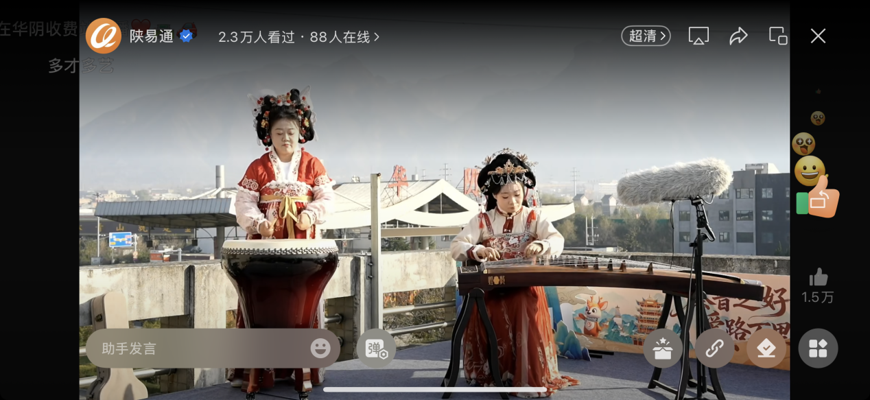 11月28日14时,“秦晋豫之好·常来长安”车主节启幕,运营管理公司首次联合交通运输部路网监测与应急处置中心“中国路网”官方视频号同步直播。河南三门峡分公司收费管理部副经理秦红梅作为嘉宾,在直播间分享“黄金旅游线”,来自山西的车友代表也介绍了一系列自驾游参与经验,进一步点燃直播间的氛围。随后,精彩的文艺表演轮番登场。最让人热血沸腾的,当属国家级非遗传承人、“2022中国非遗年度人物”张喜民携团队登台表演华阴老腔。苍劲唱腔配合枣木梆子节奏,瞬间将直播间的热度推至万峰值。