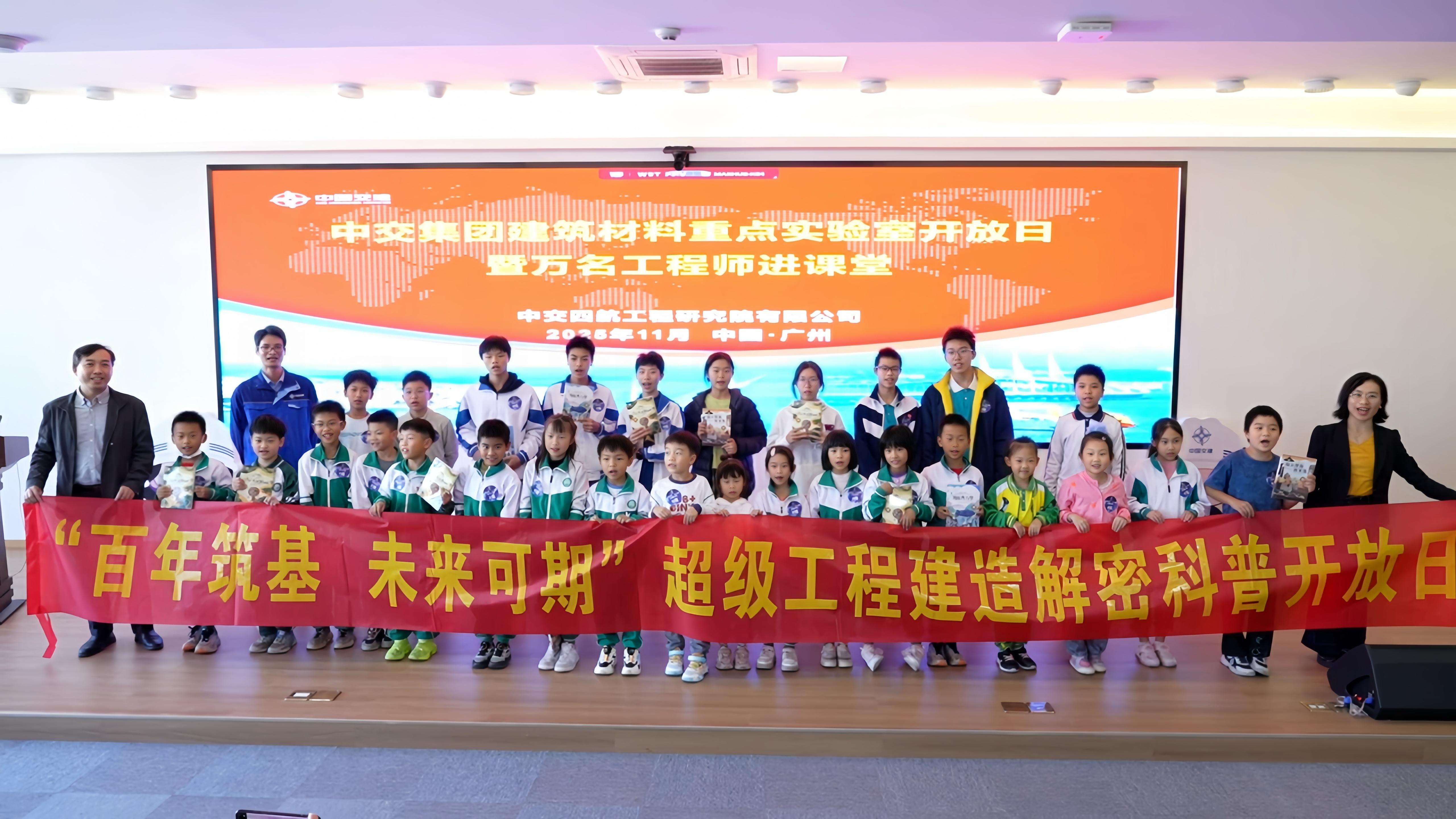 近日,由中交集团建筑材料重点实验室(以下简称“实验室”)主办的“百年筑基 未来可期”超级工程建造解密科普开放日暨万名工程师进课堂活动在广州中交四航科技园举行。本次活动吸引了来自广州市白云区竹料第一中学、竹料第一小学、太和第一小学等14所中小学校的近40名中小学生参与,共同开启了一场别开生面的科学探索之旅。