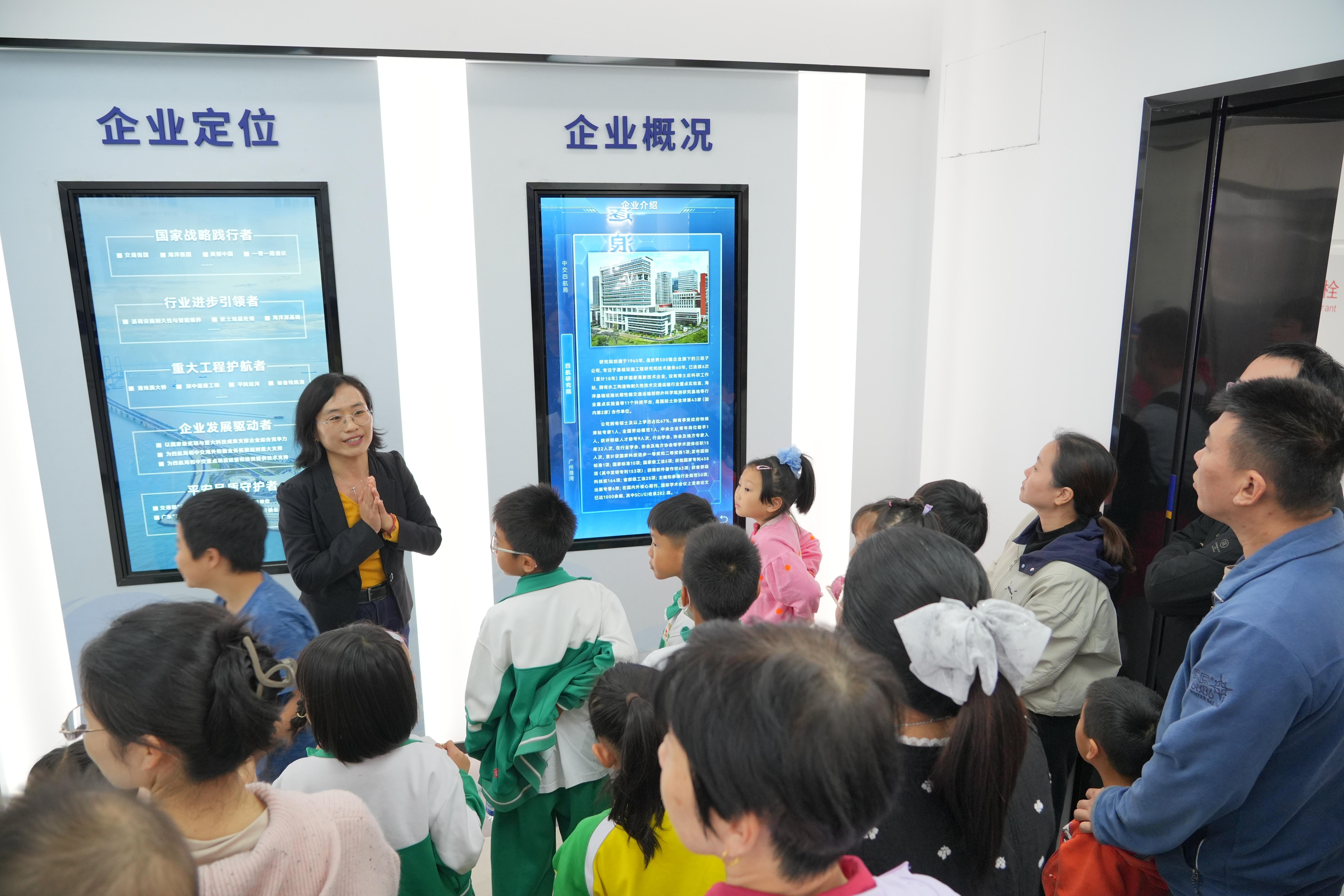 在四航科创展馆中,中交集团建筑材料重点实验室副主任刘梅梅博士为同学们系统讲述了四航局研究院60年的发展历程,通过讲解工程师们在港珠澳大桥等重大工程中攻坚克难的故事,生动展现了科技工作者不懈奋斗的精神,激励同学们立志为祖国交通建设贡献力量。