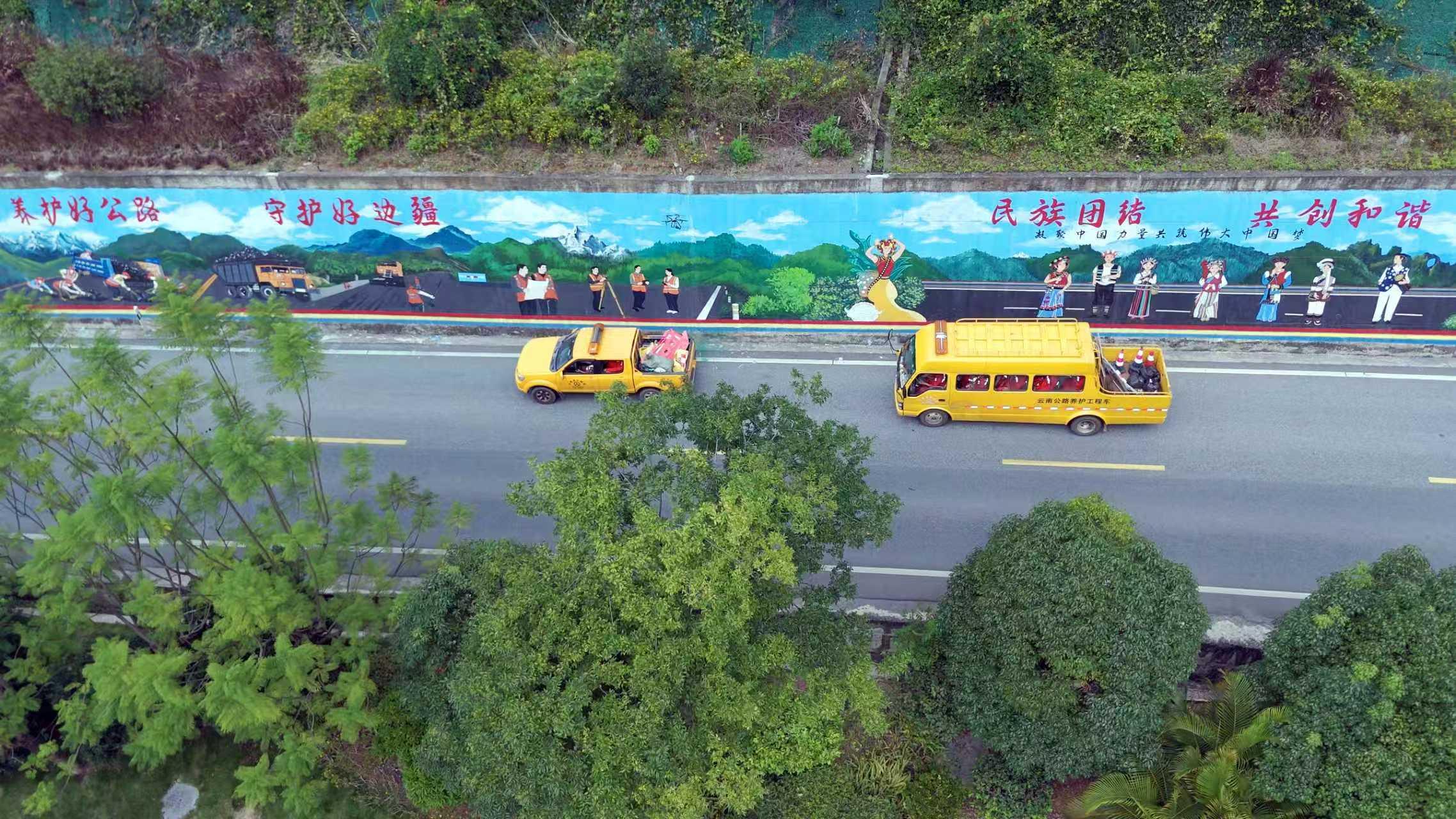 建设过程中,兼顾生态与人文融合发展,在K7019+100—K7019+600路段护坡绘制精美彩绘,生动勾勒出峡谷公路人专注作业、协同攻坚、民族团结的鲜活场景,工程机械与青绿山峦在画中自然相融,既还原了峡谷公路人的实干身影,更以艺术笔触诠释了“筑路为民生,生态共守护”的责任担当。