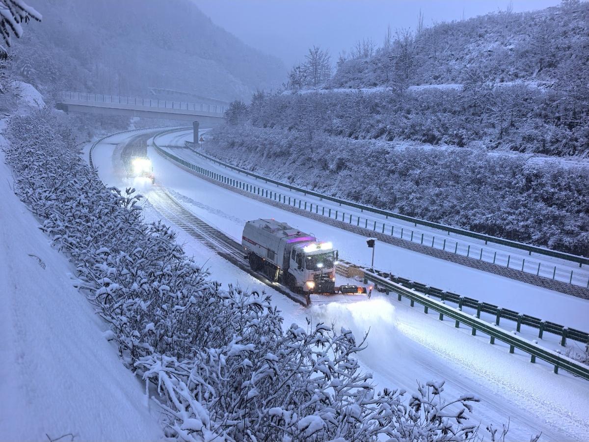 陕西各地市公路局、高速公路运营单位积极配合交警部门对部分路段实施管控,除雪车、融雪剂撒布机等设备不间断持续作业,以“机械为主、人工为辅”的梯队作业模式,重点针对桥隧、坡道、弯道等关键路段进行融雪防滑处理。养护人员加大巡查频次,设置警示标志,引导过往车辆安全通行。