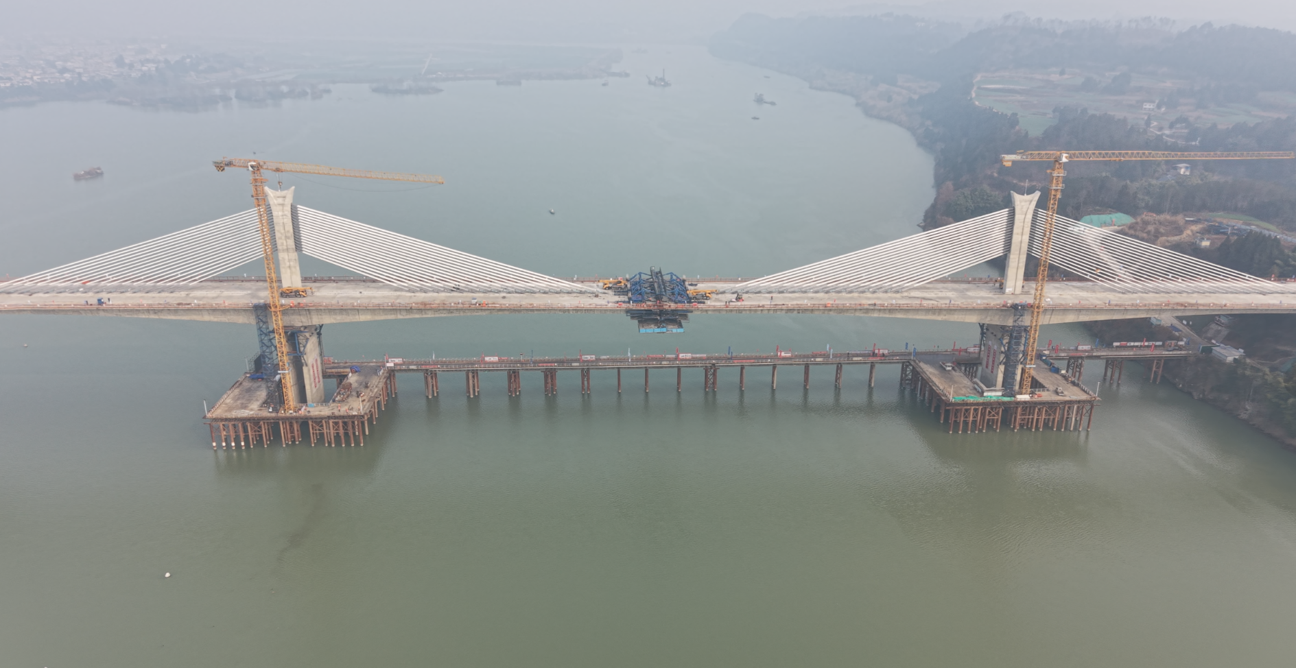 阆营高速嘉陵江特大桥全长1379米,主桥长490米,横跨嘉陵江,采用大跨径“斜拉现浇”箱梁结构,其合龙精度要求高:轴线偏差须小于10毫米,高差控制在15毫米以内。此次合龙的240米主跨是全线技术难度最高、施工风险最大的关键节点,其顺利完成为后续工程推进奠定了坚实基础。