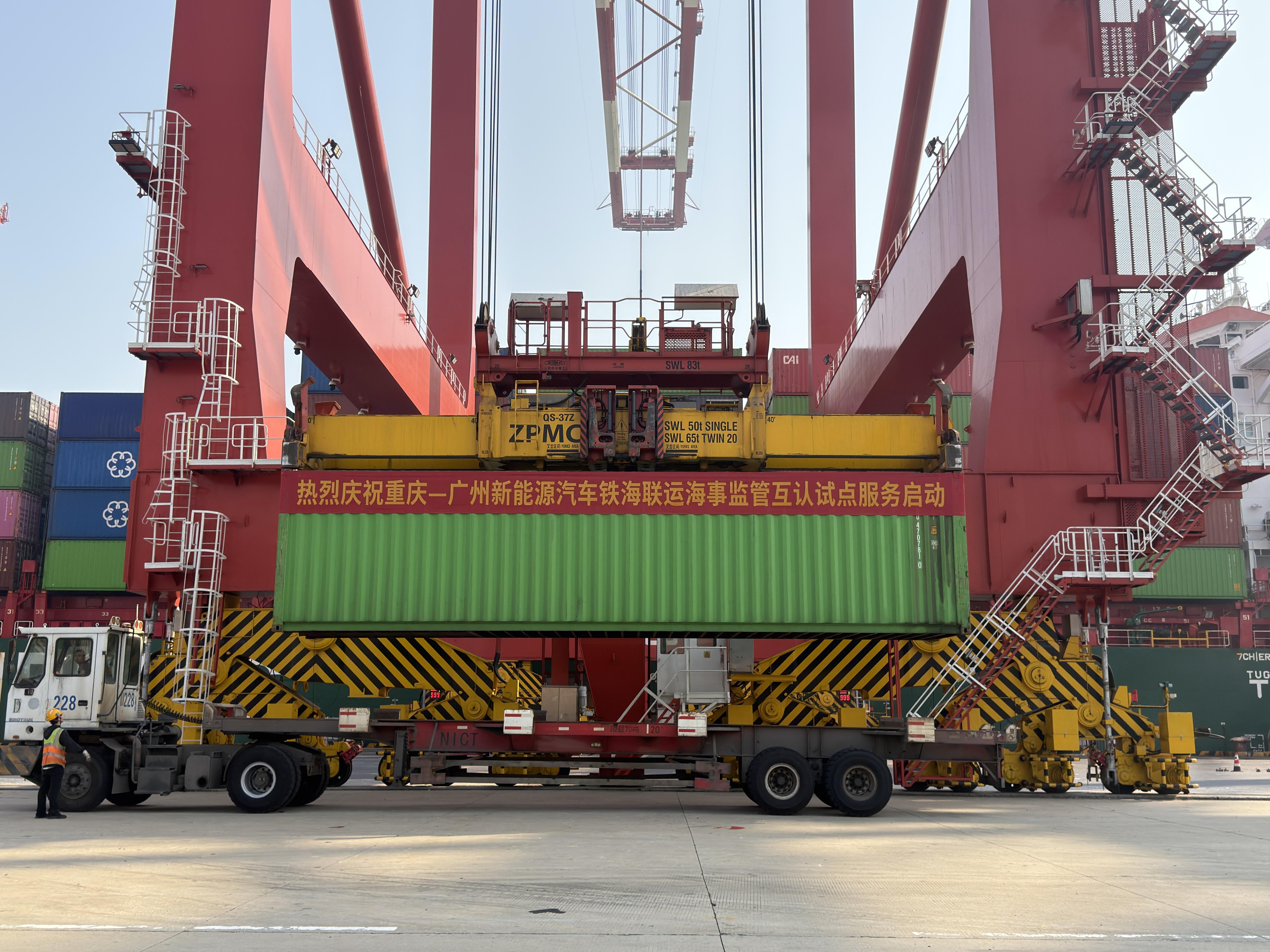 1月19日,装载着108辆“重庆造”新能源汽车的36个集装箱在广州港南沙港区顺利完成吊装启运,标志着“重庆-广州新能源汽车铁海联运海事监管互认试点服务”顺利实施,一条连接西南与华南的新能源汽车出海绿色新通道成功贯通。