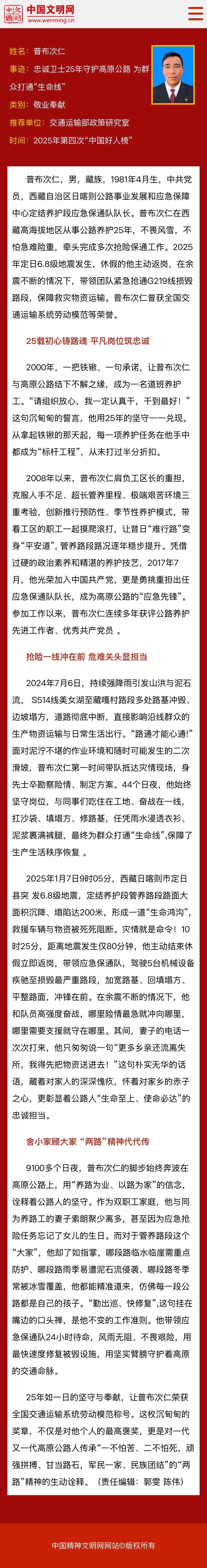 “中国好人榜”发布仪式于1月23日在四川省宜宾市举办。经各地推荐、网友评议和专家评审等环节,共有139名助人为乐、见义勇为、诚实守信、敬业奉献、孝老爱亲身边好人光荣上榜。西藏自治区日喀则公路事业发展和应急保障中心定结养护段应急保通队队长普布次仁获评敬业奉献中国好人。