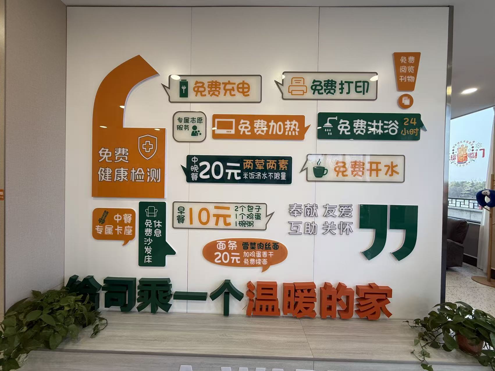 司机之家内设健康监测、阅览休息、淋浴洗衣、微波加热等多个功能区,推出包括免费健康监测、24小时热水淋浴、免费充电、免费沙发休息、免费打印、专属志愿服务等10项暖心举措。休息区配备可伸缩躺椅、报刊架及充电设备;健康监测区可实时测量血压、血氧等指标;淋浴区与洗衣区相结合,方便司机途中清洁整理,有效节省他们的途中时间。