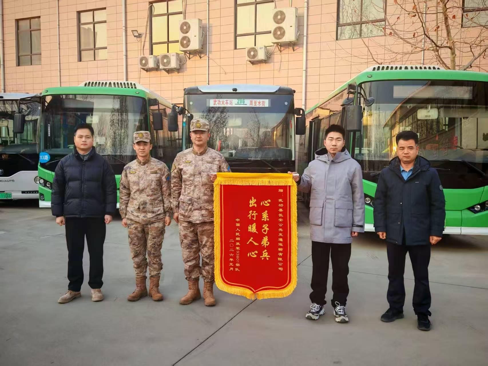 1月22日,解放军某部负责人来访,代表全体驻武官兵及家属对武功县交通部门及公交公司表示诚挚感谢并赠送“心系子弟兵,出行暖人心”致谢锦旗。该部负责人表示,公交线路的延伸不仅是一项便民工程,更是武功县扎实做好双拥工作的具体体现,让官兵们深切感受到了地方人民的深情厚谊与拥军热情。