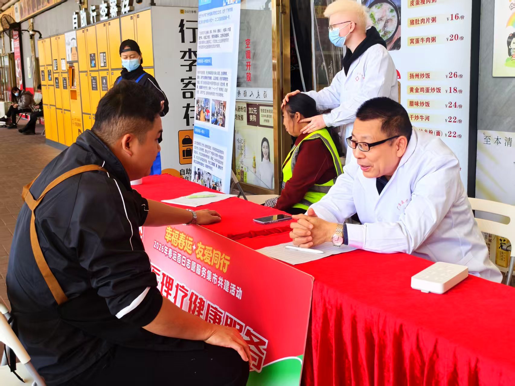 同时,老中医林院昌医生,在专区旁设中医问诊台,提供免费问诊、血压测量服务。问诊台前客流不断:有怀抱幼儿的母亲咨询产后恢复,有奔波的商务人士请求调理开方,有疲惫老人测量血压、咨询养生……山遥路远,健康正是旅客顺利返乡、与家人团圆的底气。