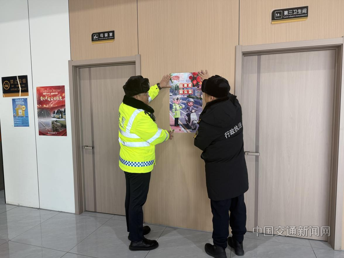 在黑河公路客运总站,执法人员与公安民警化身 “安全宣传员”,向旅客、驾驶员发放《安全回家 平安春运》宣传单,面对面讲解春运安全须知、冰雪路面行车要点、合法车辆识别方法及12328热线使用指南。同时,在客运车辆内张贴 “系好安全带” 海报,强化 “安全带 = 生命带” 理念;在客运站候车大厅、售票窗口等重点区域张贴拒乘 “黑车” 海报,告知安全隐患,引导市民选乘合规车辆,从源头降低出行风险。
