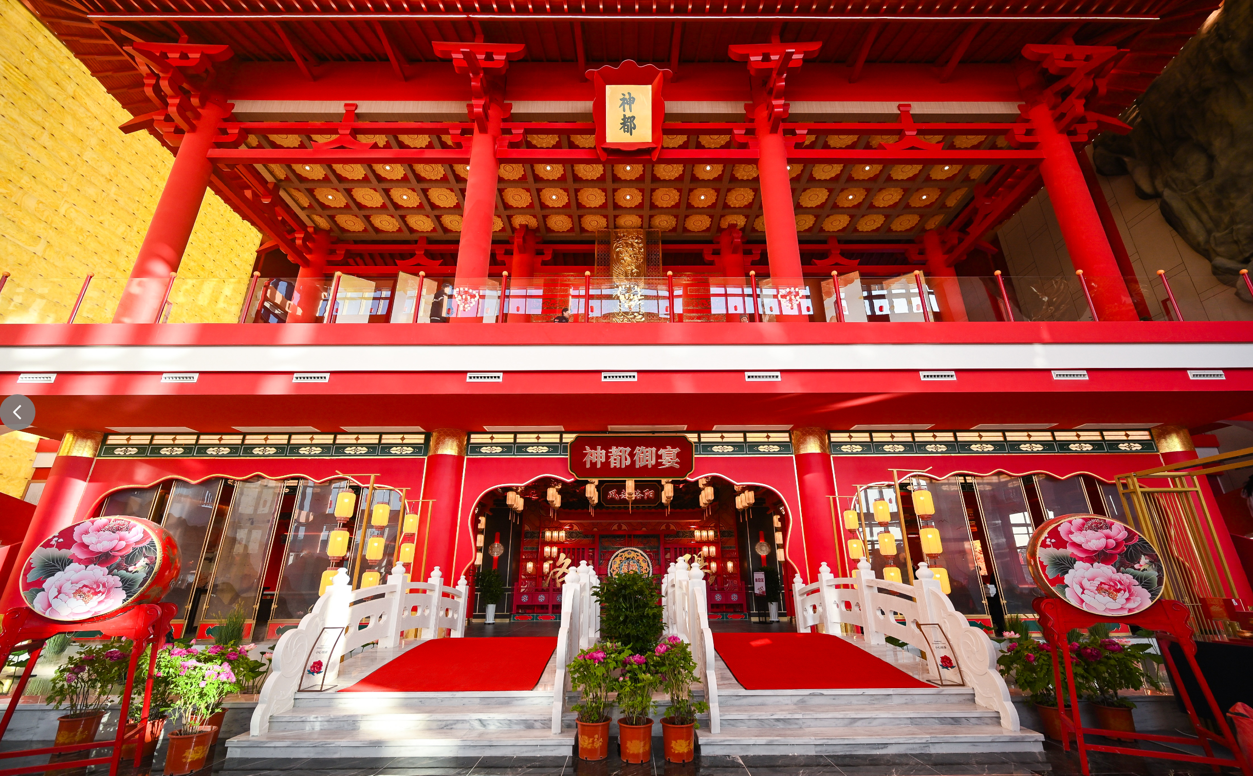 踏入服务区,即刻“穿越”至隋唐皇城——以洛阳皇城为蓝本的综合楼飞檐翘角、金牡丹纹拱门尽显皇家气韵,正门“定鼎门”与两侧“永通门”“厚载门”遥相呼应,曲折廊桥与迎客亭构成天然打卡点,整座建筑宛如巨型中式盆景,意境十足。每日定时上演的《霓裳羽衣舞》《洛神赋》等唐代乐舞及豫剧选段,让司乘在休憩中沉浸式感受传统文化魅力。