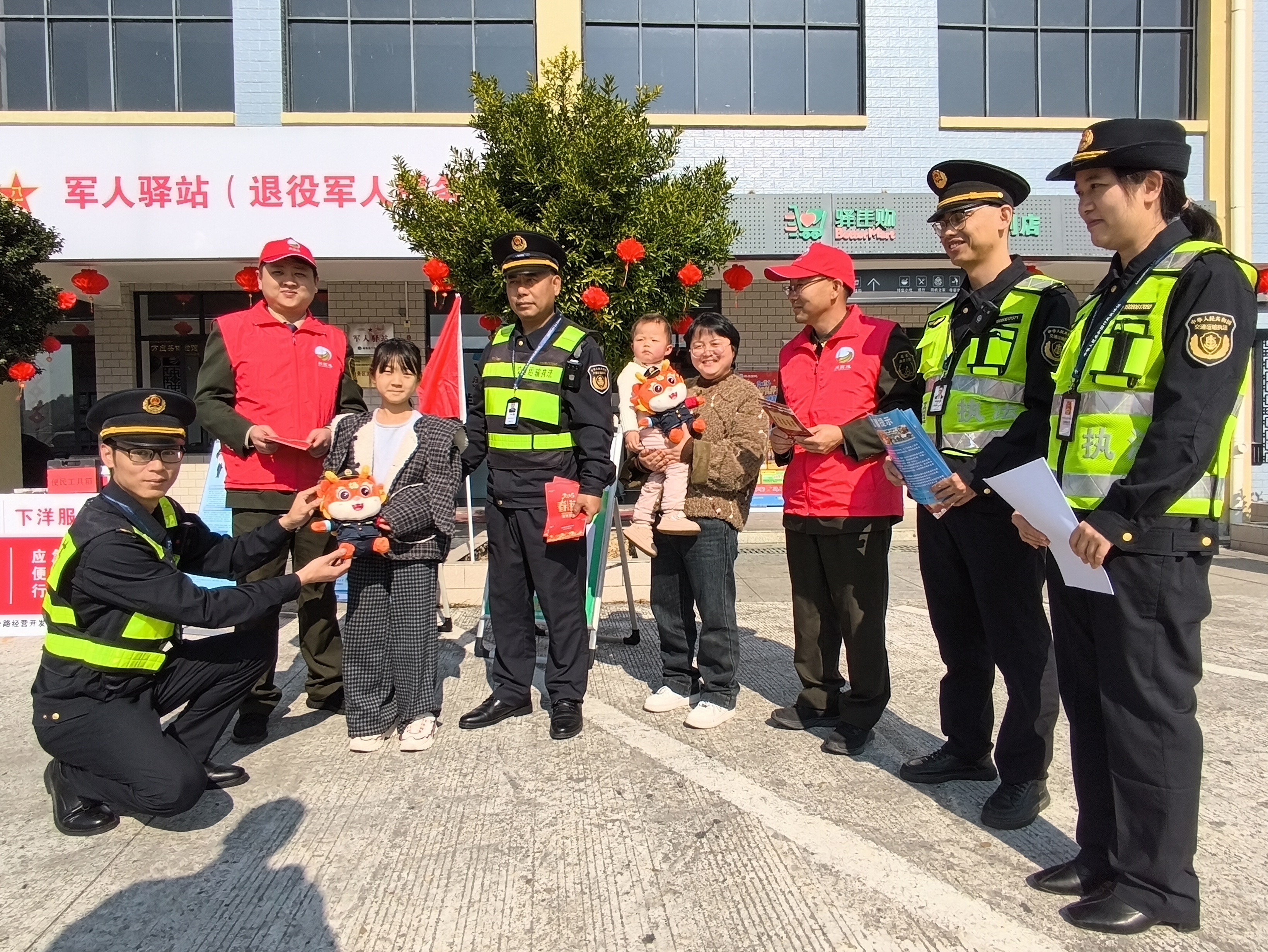 春潮涌动启新程,春运护航正当时。2026年春节返乡高峰来临之际,为守护万千群众平安归途、破解跨区域高速执法壁垒,2月12日,福建省龙岩高速公路行政执法支队四大队携手广东省梅州市大埔县交通运输局、高速交警及龙岩高速运营公司,以“共建、共治、共享”为理念,在下洋服务区、下洋收费站联动开展跨区域联合执法专项行动。此次行动以闽粤同心之合力铸就春运安全坚盾,为返乡群众铺就平安坦途。