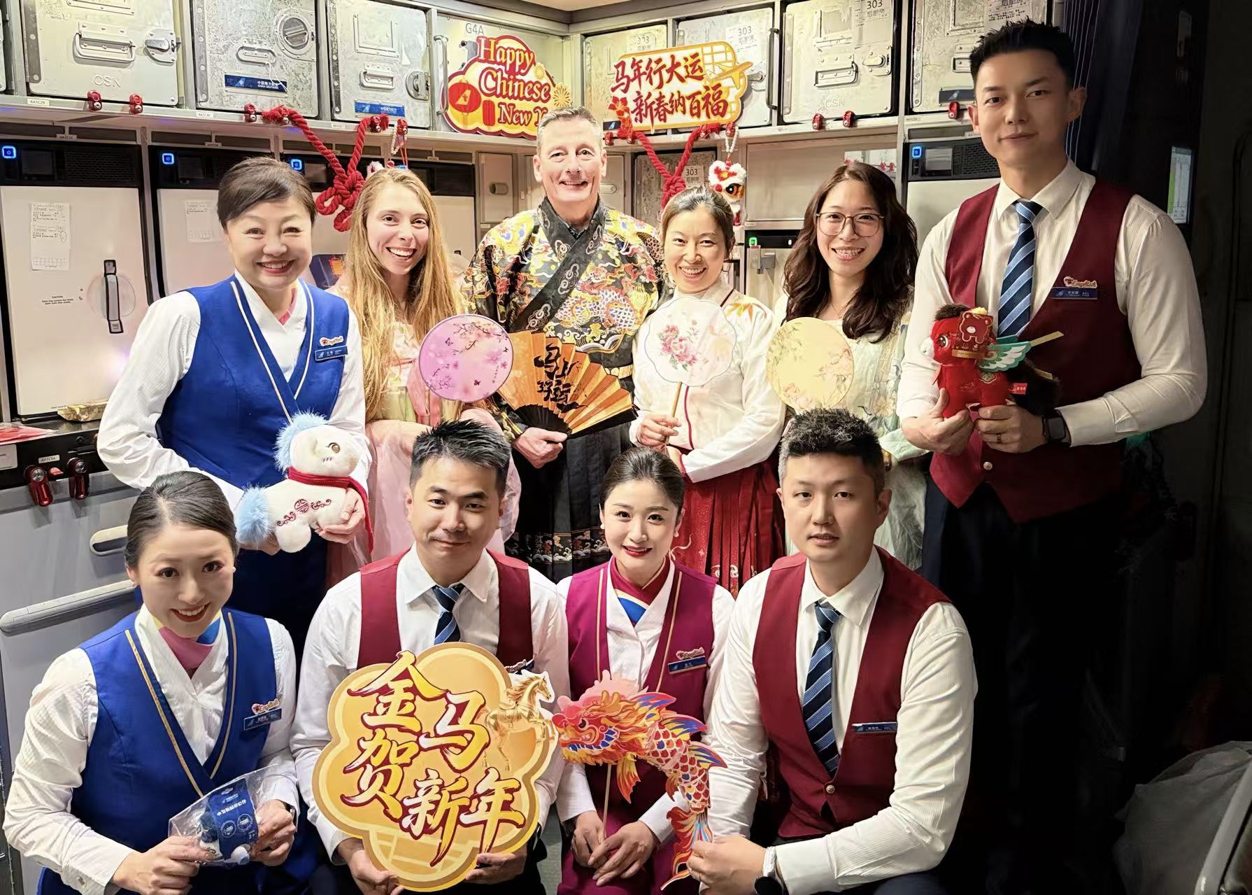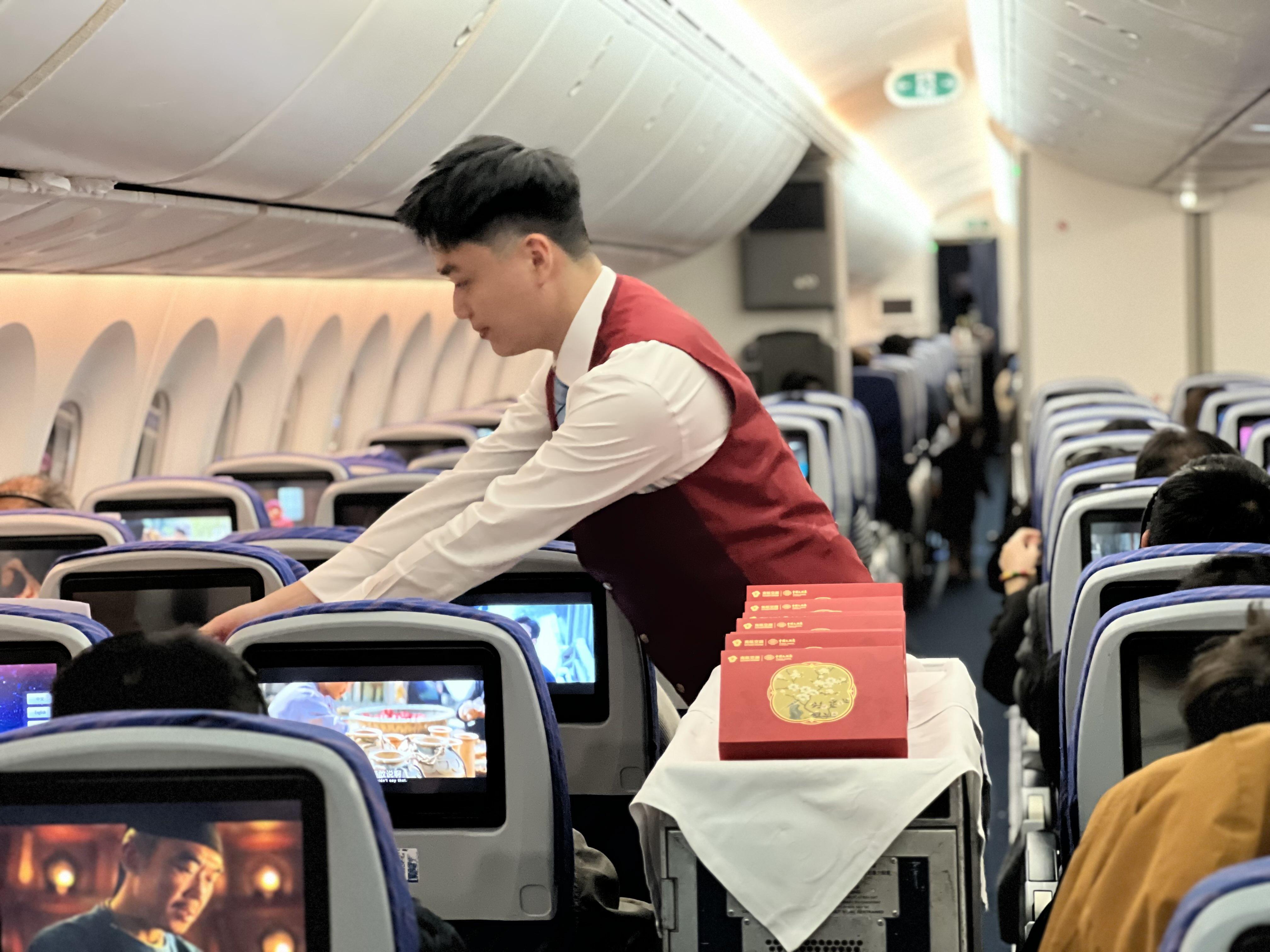 春节期间,南航在15个国际航班上开展“木棉新禧”暨“云端中国年 幸福新航程”主题航班系列活动,客舱内装饰二十四节气海报、福字贴、红灯笼,处处洋溢着喜庆祥和的节日氛围。其中,在广州-阿姆斯特丹航班上展示汉服雅韵,邀请外籍旅客沉浸式感受中华优秀传统文化的独特韵味。在广州-伦敦航班上,乘务员向旅客们展示团扇、生肖玩偶,用双语讲述年俗故事。在广州-奥克兰航班上,邀请中外旅客当“财神”,为航班上的旅客送上节日祝福。