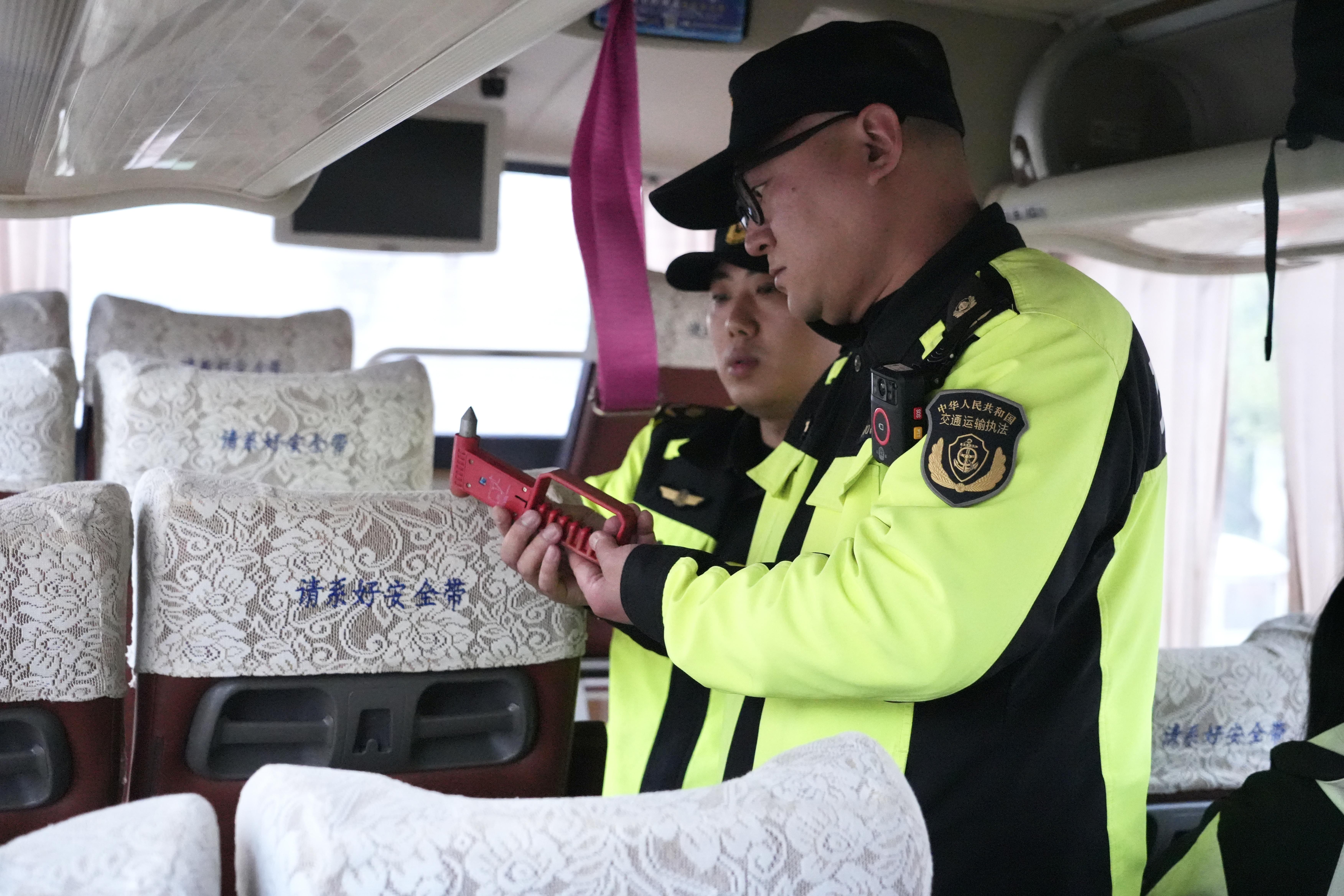 执法人员在附近重点区域展开“定点检查+流动巡查”,对过往旅游包车进行逐车检查,仔细核对车辆营运资质、驾驶员从业资格,并上车检查安全锤、灭火器等安全设施配备情况。从车辆技术状况到游客实名登记,每一个环节都一丝不苟,现场秩序井然。