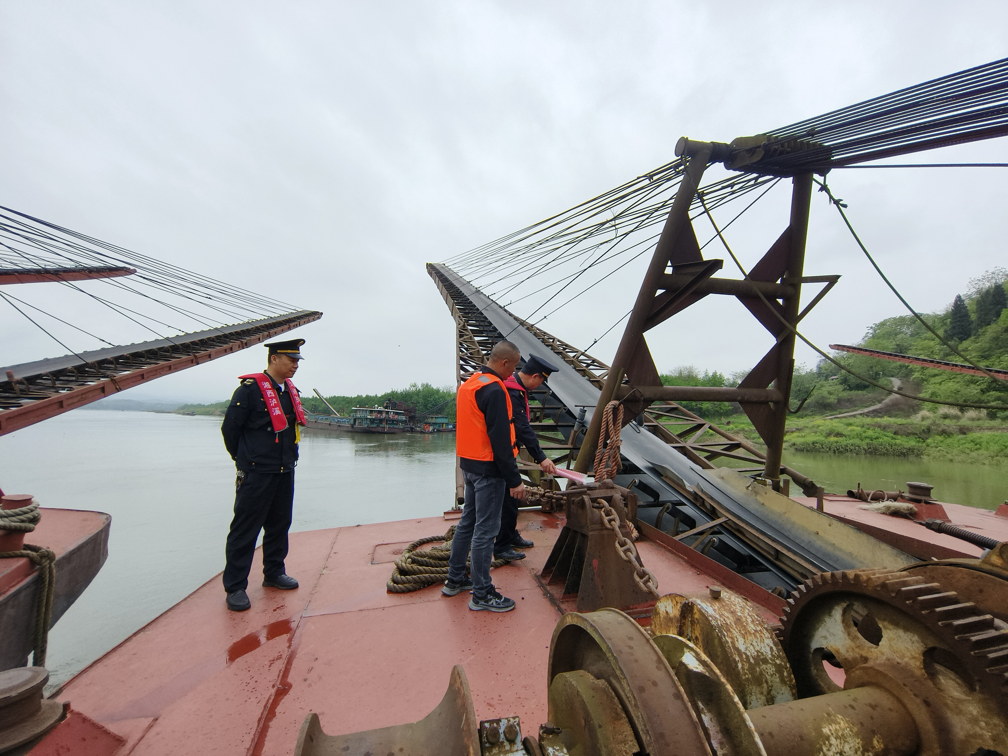 在汀流滩航道应急抢通工程施工点,检查组对特种施工船作业情况进行全面检查,核查了船舶配员、施工方案、安全监测数据及应急预案,利用无人机勘探、水下声呐监测等科技手段筑牢防线。督促施工方负责人,要以安全渡汛为第一原则,在主汛期到来前增设汛期专项监测点,在大暴雨、高水位、疾流水等高风险时段及时暂停作业,绝不能为抢工期冒险施工。