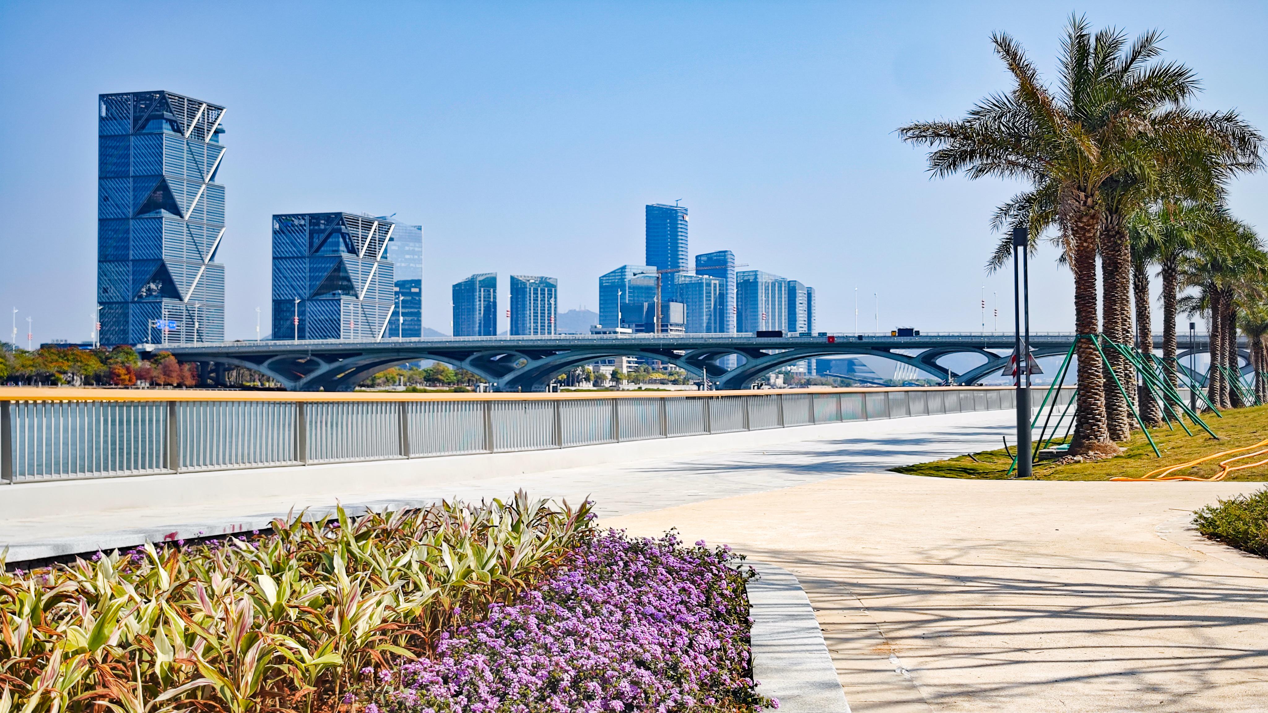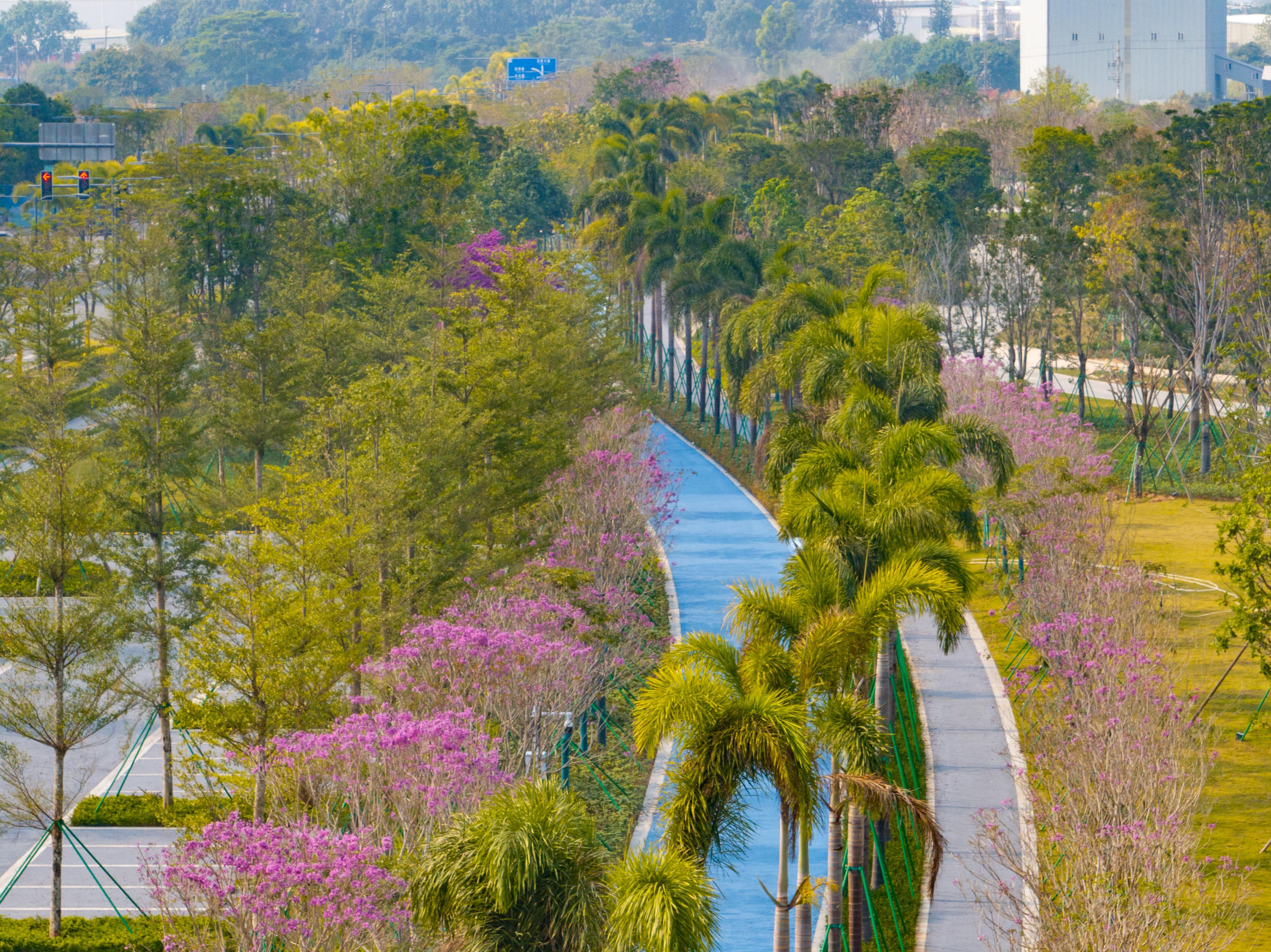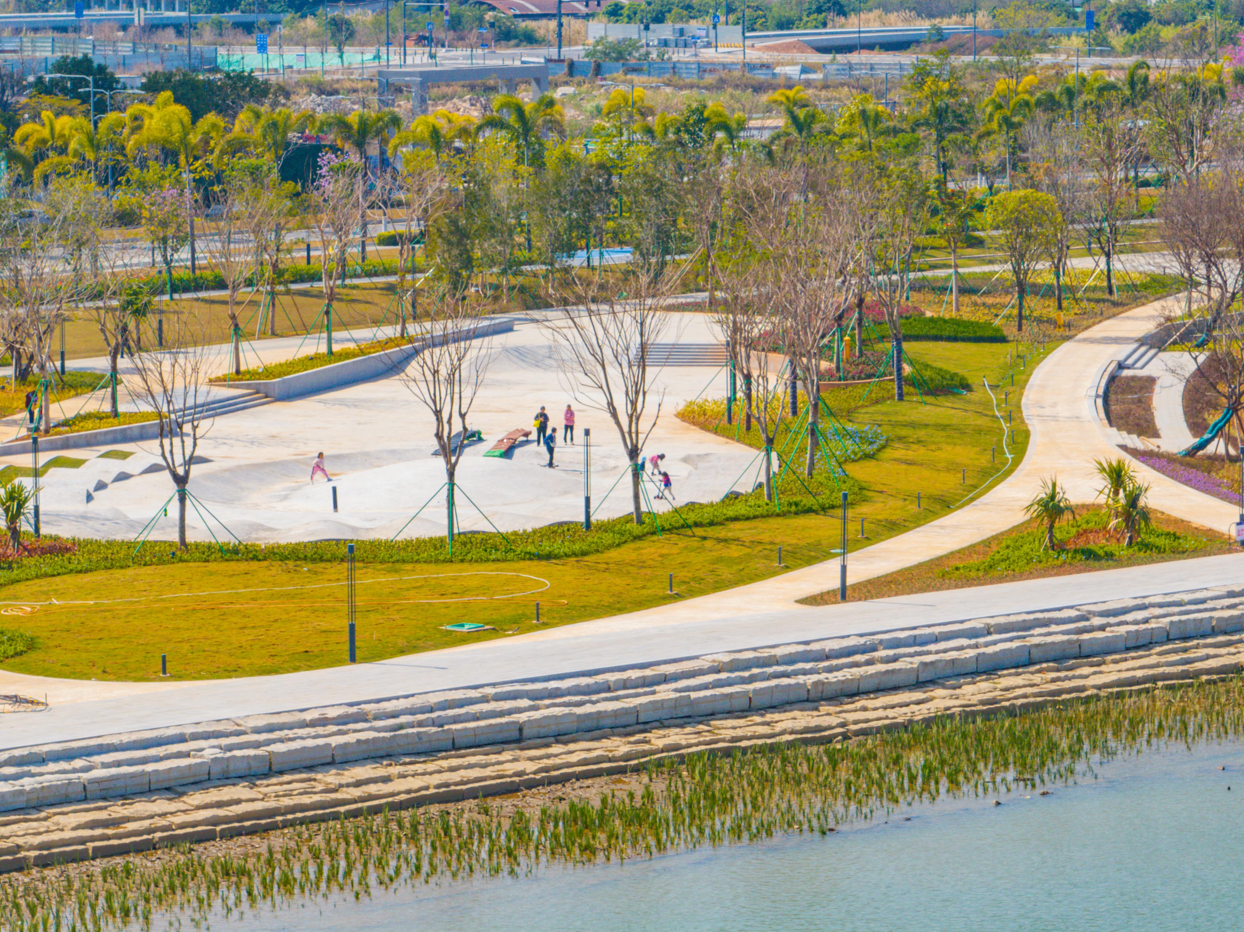 红树水湾、花舞广场等核心景观节点同步亮相。在“红树水湾”节点,开阔茂盛的绿色景致让人纷纷停下驻足。这里并非简单的绿化,而是基于耐盐碱、抗台风挑战构建的立体生态群落。中交二航局现场负责人秦星介绍:“我们精挑细选超过230种植物,其中九成以上为凤凰木、假苹婆、黄槿等乡土适生树种,并创新引入银叶树、海滨木槿等耐盐碱植物,确保在滨海环境中长期稳定生长。”