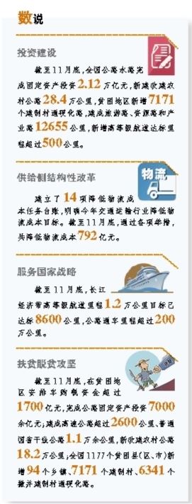 截至11月底,在贫困地区安排车购税资金超过1700亿元,完成公路固定资产投资7000余亿元;建成高速公路超过2600公里、普通国省干线公路1.1万余公里,新改建农村公路18.2万公里;全国1177个贫困县(区、市)新增94个乡镇、7171个建制村、6341个撤并建制村通硬化路。