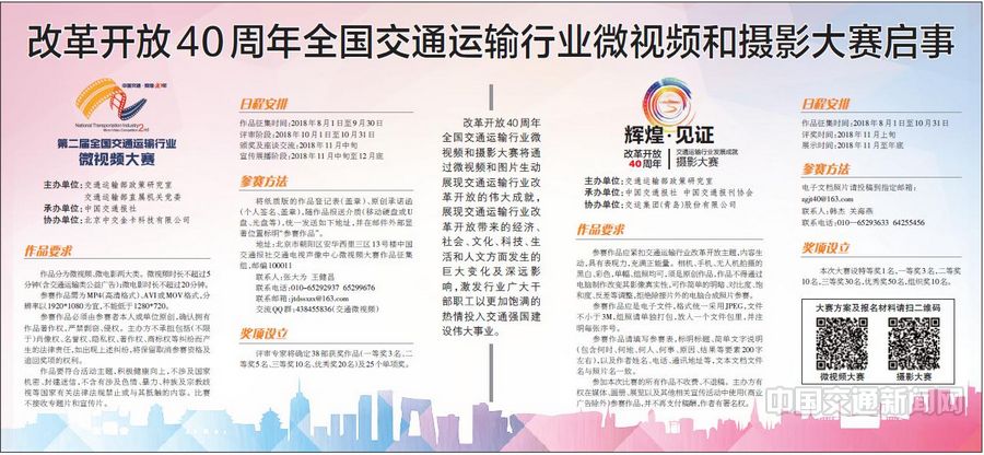 近日,由交通运输部主办的“中国交通·辉煌40年——交通联合杯”全国交通运输行业微视频大赛和“辉煌·见证”改革开放40周年全国交通运输行业发展成就摄影大赛正式启动。