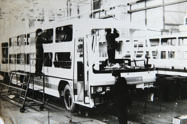 郑州客车厂生产车间,工人们正在紧张而忙碌地制造卧铺客车。