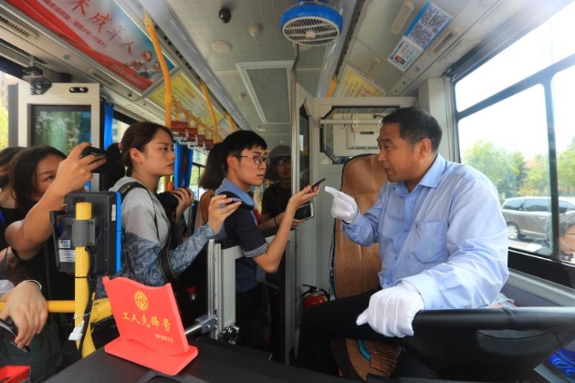 嘉兴市95路省级工人先锋号公交车驾驶员黄伦标在红船学院公交首末站接受采访团采访。