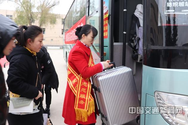 陕西西安纺织城客运站为10所大专院校开通了“校园直通车”购票平台,务工人员返乡直通车也已开通,返乡客运班车将上门售票、上门安检、上门接送旅客。图为纺织城客运站工作人员帮助乘客搬运行李。记者 白秋薇 文 韩娇 图