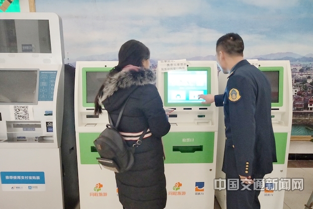 江西省上饶市铅山县运管所驻站人员帮助旅客在自助取票机上取票。官兴炜 摄