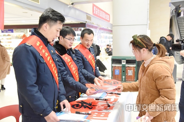 向旅客发放福字。郝卫 供图