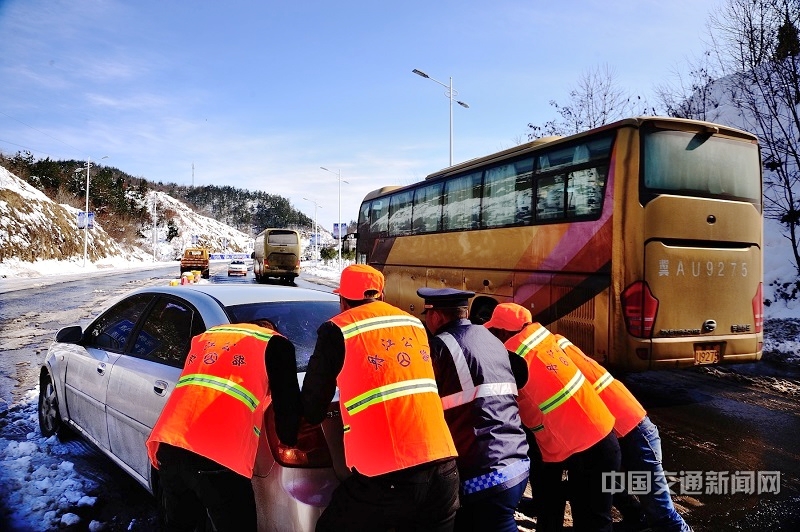 近日,湖北省局部地区遭受雨雪天气,交通运输系统积极开展安全保畅行动。丹江口市公路职工合力帮助车辆脱困。记者 潘庆芳 文 通讯员 杨道三 图
